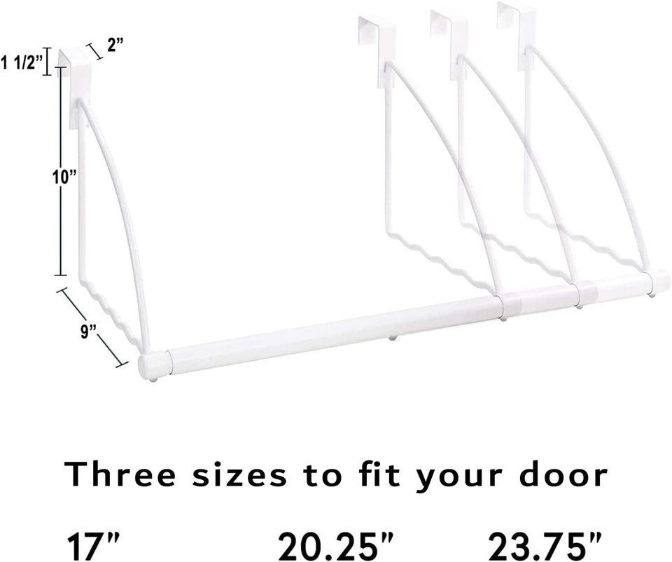 OVER THE DOOR HOOK RACK: Over-the-door closet rack will add more storage while needed. Towel hooks are the space-saving alternative and addition to the wardrobe and cupboard. QUICK & EASY TO INSTALL: This over-the-door bar for hanging clothes is ready to use, take bathroom door hooks out of the package and hang them over the door to use. EXPANDABLE & HIGHLY CONVENIENT: Unlike other hook rack over the door, our over door heavy duty hook is both expandable to 3 sizes . You can hang on the rod and the 2 sides. WIDELY USED COAT HOOKS: Over the door hooks rack is convenient for hanging clothes. Our door clothes hangers for hanging can be used in the bedroom, bathroom and other places. PREMIUM DURABLE CONSTRUCTION: Our over the door hook for thick doors is made of durable metal. Door hanger hooks are non-bendable and made from rust proof material.