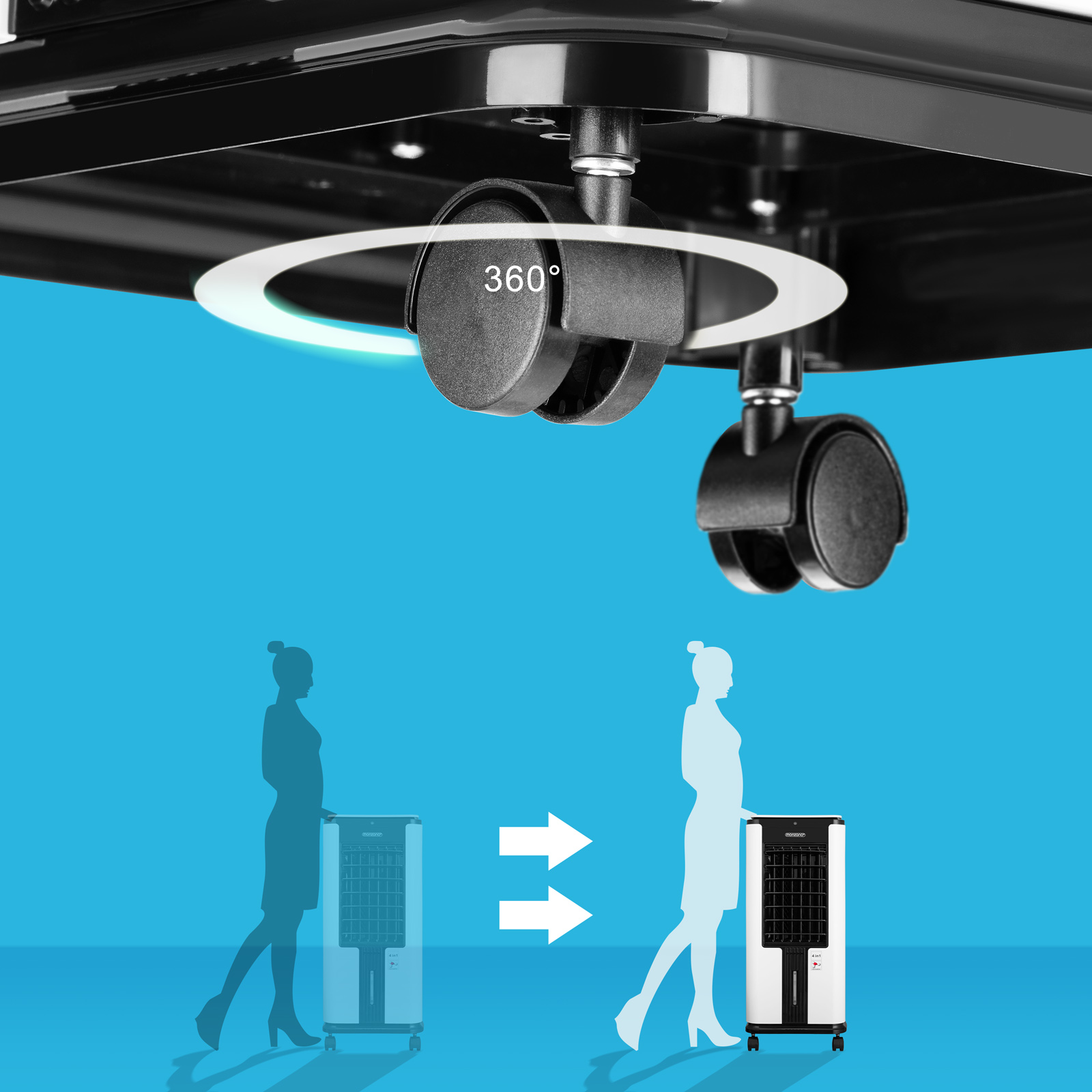 Le rafraîchisseur d'air dispose de roulettes rotatives à 360° et de poignées latérales très pratiques, pour une mobilité optimale. Ainsi, vous pouvez l'installer où vous le souhaitez en un clin d'oeil et l'utiliser à l'aide de la télécommande fournie ou de l'écran LED tactile intégré, qui affiche également la température actuelle.