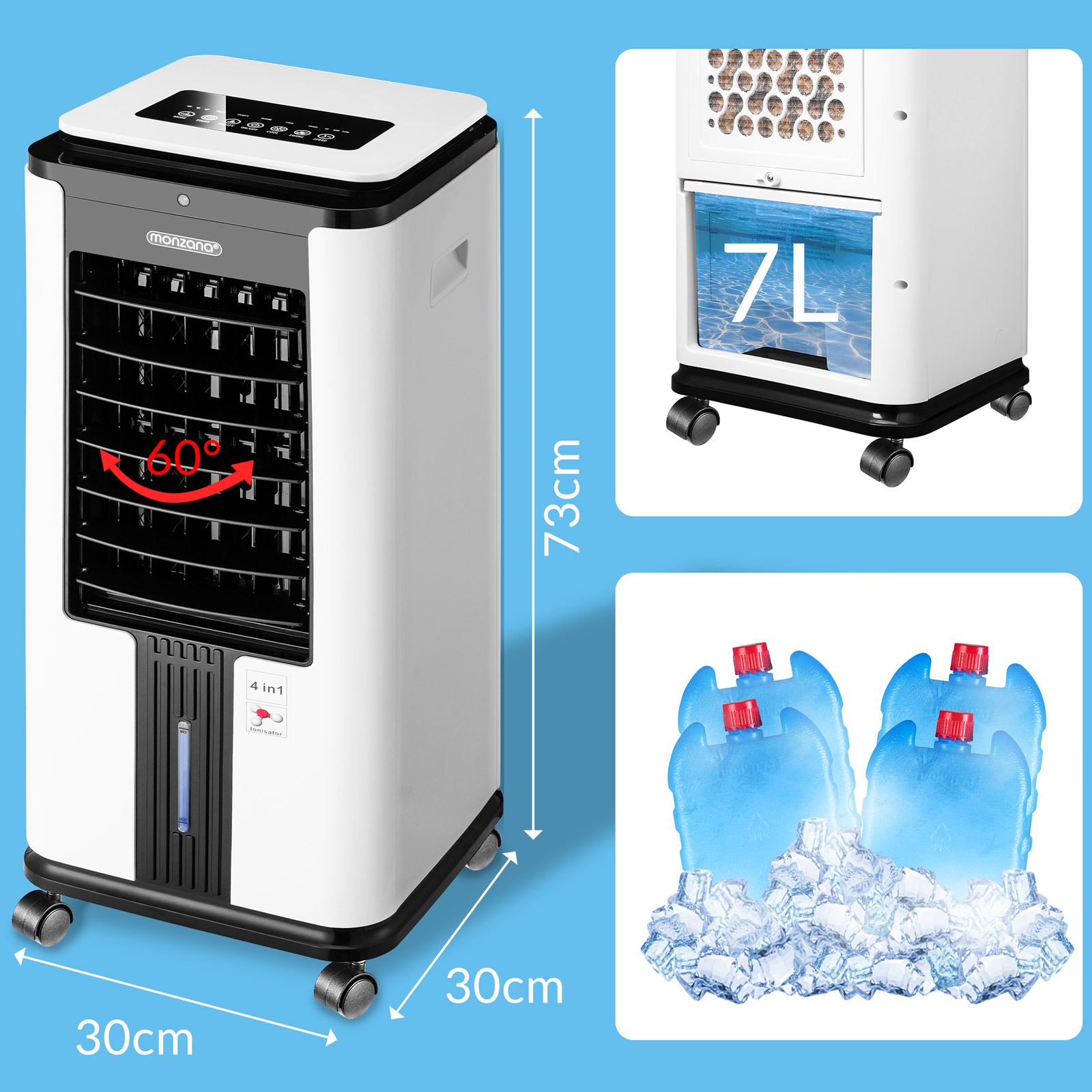 Grâce à son système d'évaporation d'eau et à son grand réservoir de 7 litres, le dispositif libère un flux d'air frais et humidifie en douceur l'air de votre pièce. La livraison comprend 4 blocs réfrigérants qui assurent un vent frais constant.
