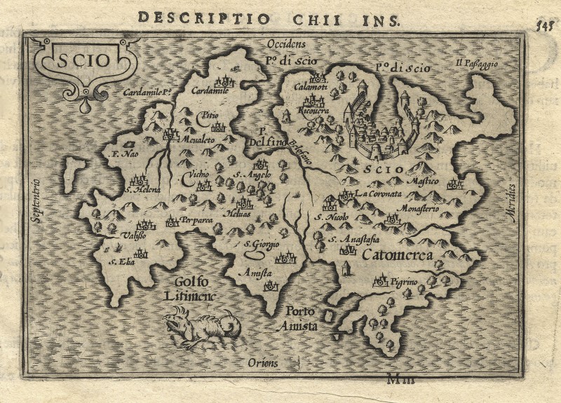 Grèce ( Grèce ) : CHIOS ( Scio / Hios ) : carte côtière, de Langenes/ Bertius 'Caert Thresoor' près de Nicolai à Amsterdam, 'Scio', 1602, 8.5x12.2 Krogt, Koemans Atlantes Neerlandici, vol. III, édition latine 1602 ou 1606 ; Zacharakis, non. 1219. - Rare petite carte. Numéro d'article : 303339