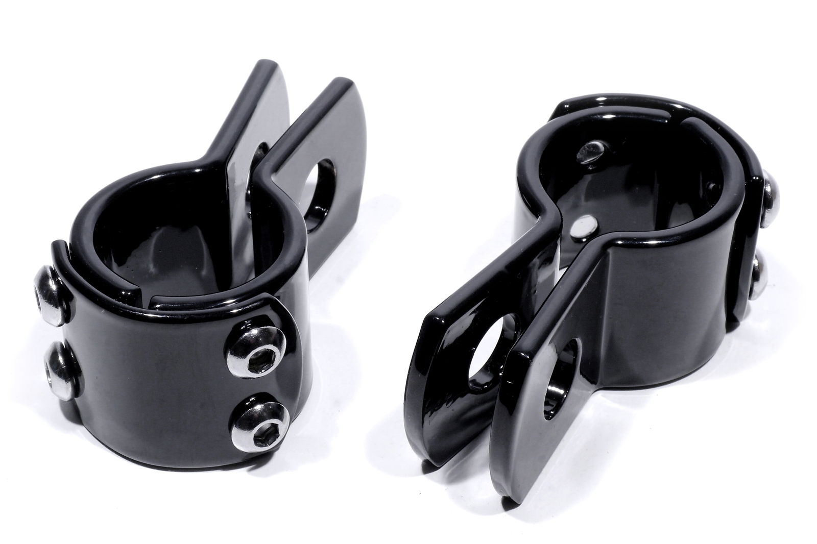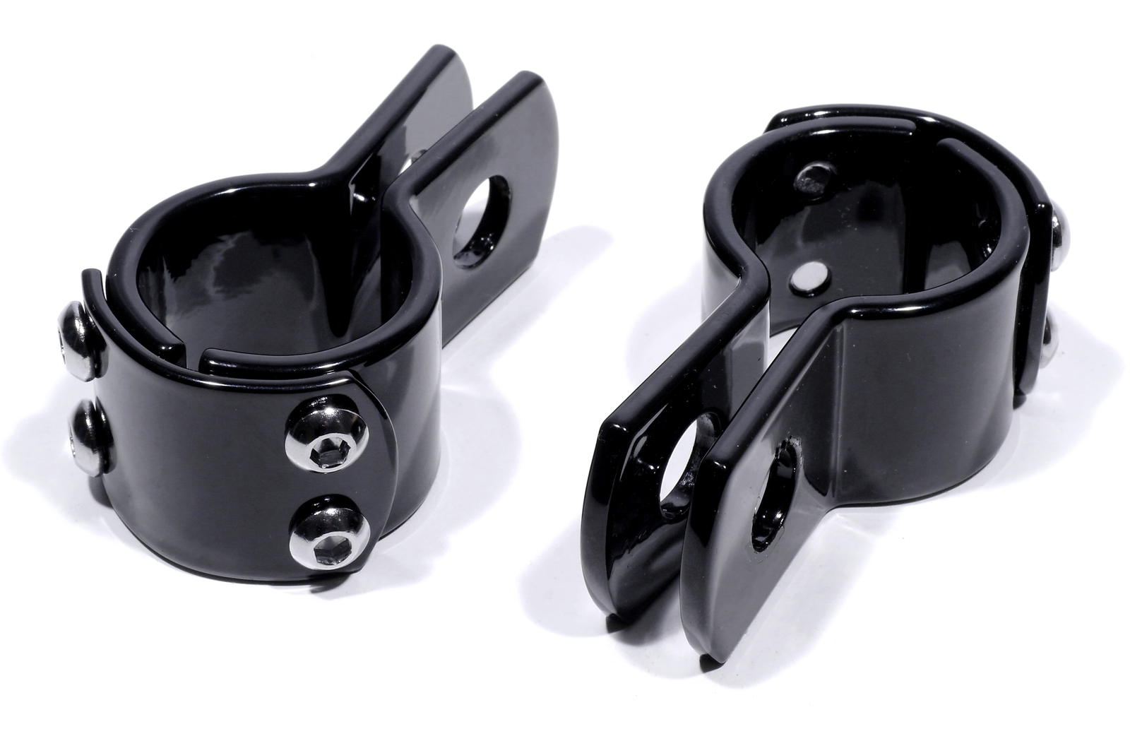 Black coated 3-piece mounting bracket with a strong quality and good workmanship with a diameter of 7/8" (22.3mm). The hole for attachment to the lugs has a diameter of 1/2" (12.9mm). For gentle attachment to the frame, crash bar or other attachment options. The price is per piece / per clamp. Other sizes as well as chrome versions are available from us