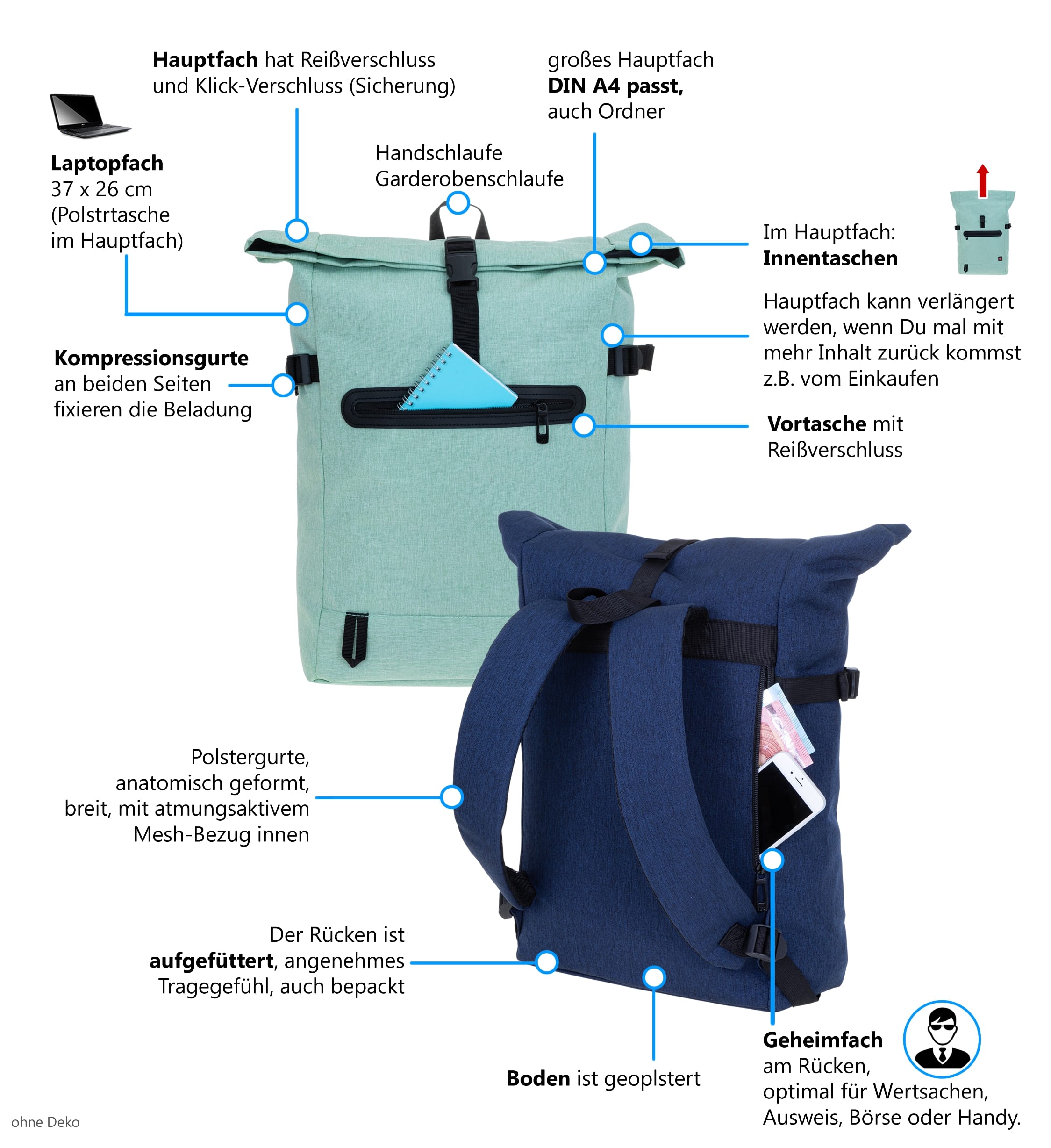 zeichnen diesen Rucksack aus. Ein Geheimfach am Rücken schützt die Wertsachen.