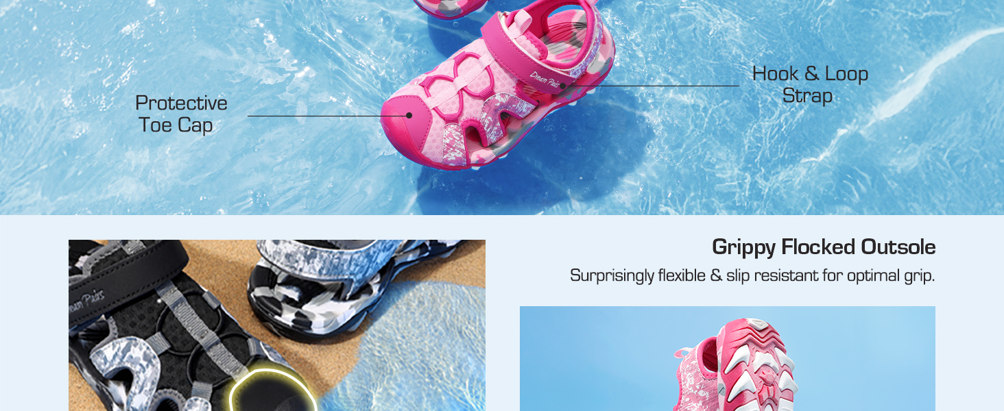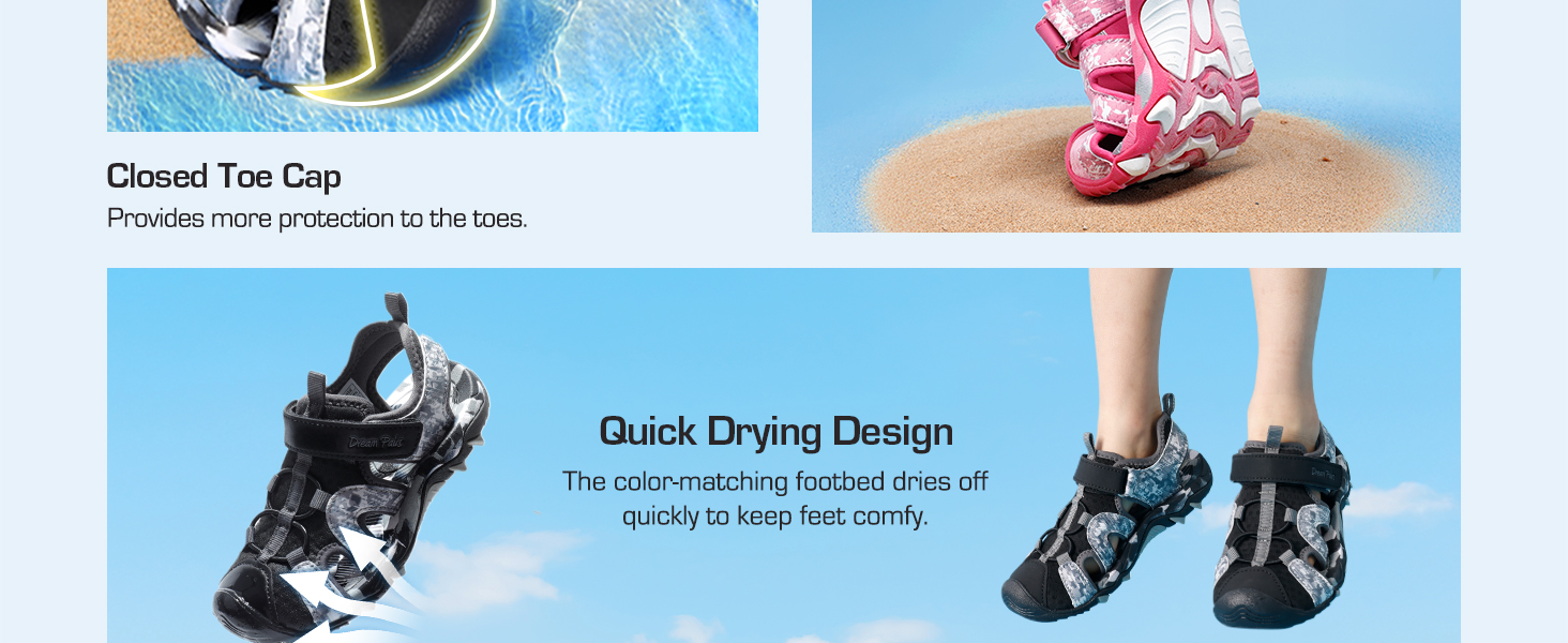 • Protective Toe Cap: Stylish camouflage elements of these kids’ sports sandals are complemented with a closed-toe design that keeps feet safe and the toe cap design protects toes.