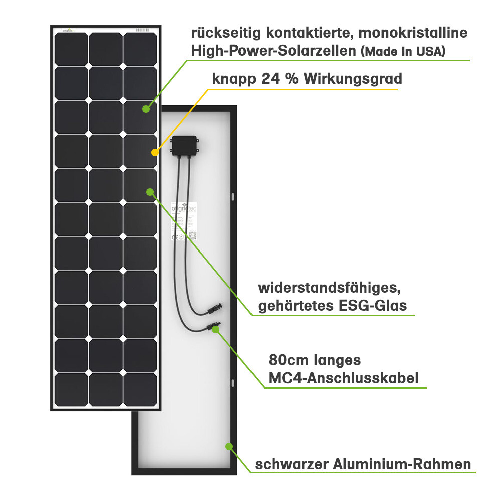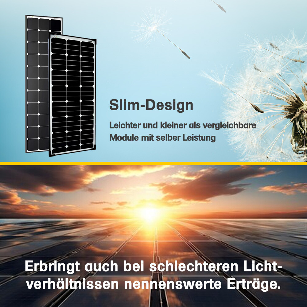 Monokristallines 120W / 12V Hígh-End Solarpanel mit rückseitig kontaktierten High-Power-Solarzellen vom amerikanischen Hersteller Sunpower - das aktuell Beste was man verarbeiten kann mit einem Wirkungsgrad von knapp 24%. Hier treffen die weltbesten Solarzellen und das neue Back-Contact Verfahren aufeinander. Das Ergebnis ist ein High-End-Produkt zu einem soliden Preis. Außerdem haben wir bei der Produktion dieser Serie besonders darauf geachtet, dass auch der Rest des Moduls den wertvollen Zellen gerecht wird. Dieses Panel ist deutlich leichter und flächenmäßig kleiner als herkömmliche Solarzellen mit gleicher Leistung. Auch die Lichtausbeute bei schlechteren Bedingungen ist bei der SP Serie höher als bei unserer normalen Mono-Serie.