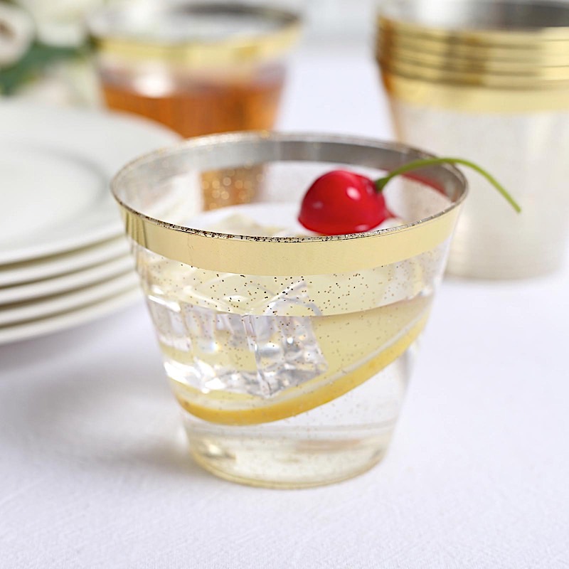 25 Glittered 9 oz Clear Plastic Disposable CUPS Gold Trim