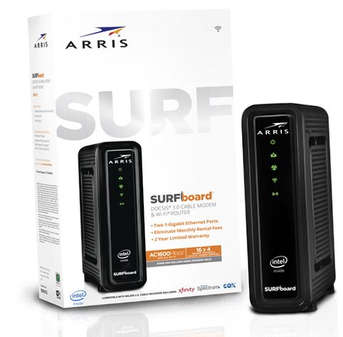 ARRIS SURFboard (16x4) Cable Modem with AC1600 WiFi Router. Approved on Xfinity Comcast, Cox, Charter and most US Cable Internet Providers for service plans up to 300 Mbps.