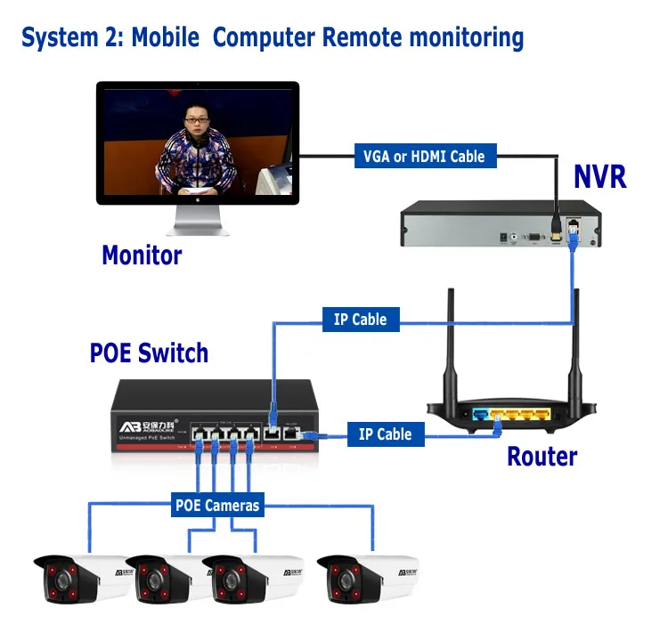 System 2: Camera + POE Switch + Router + NVR + Monitor