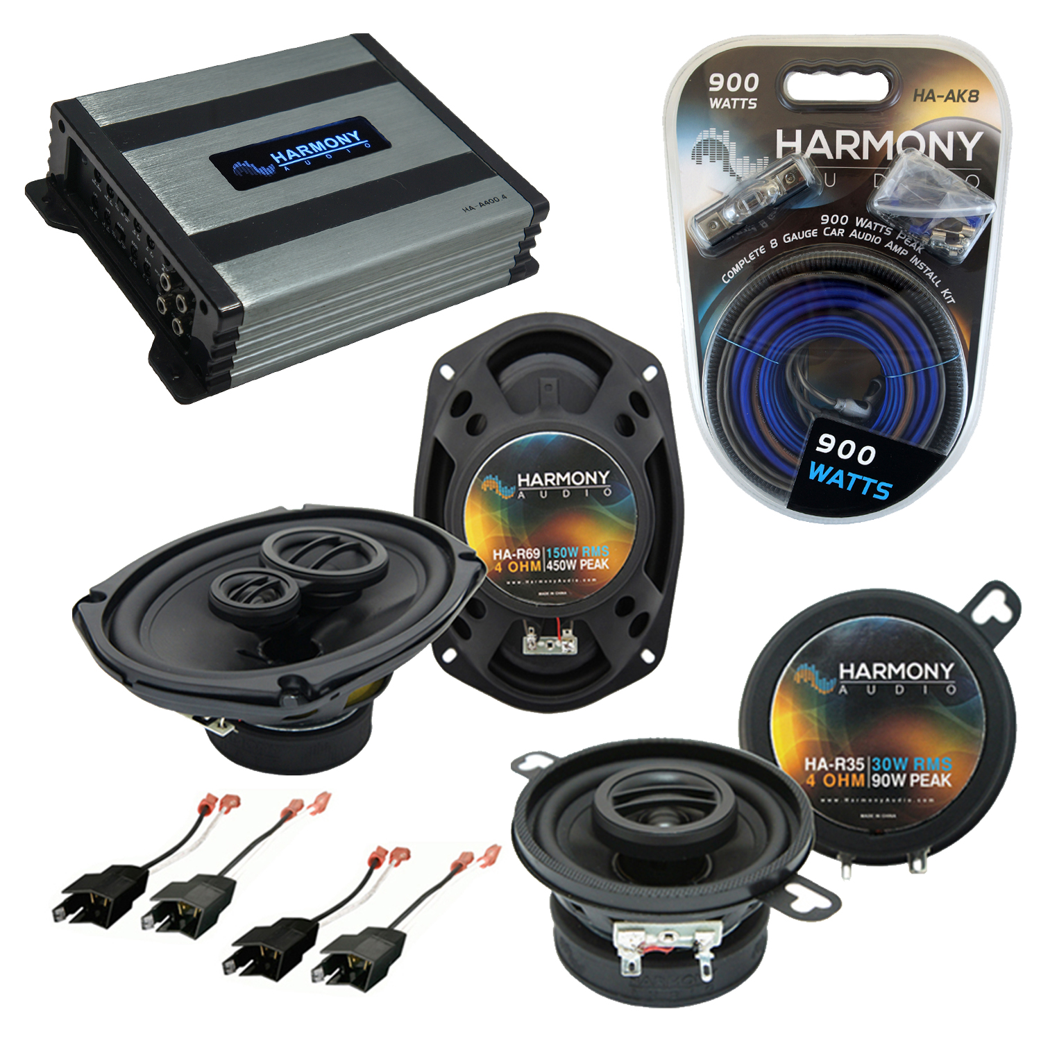 Fits Cadillac Cimarron 82-88 OEM Speaker Upgrade Harmony R35 R69 & HA-A400.4 Amp