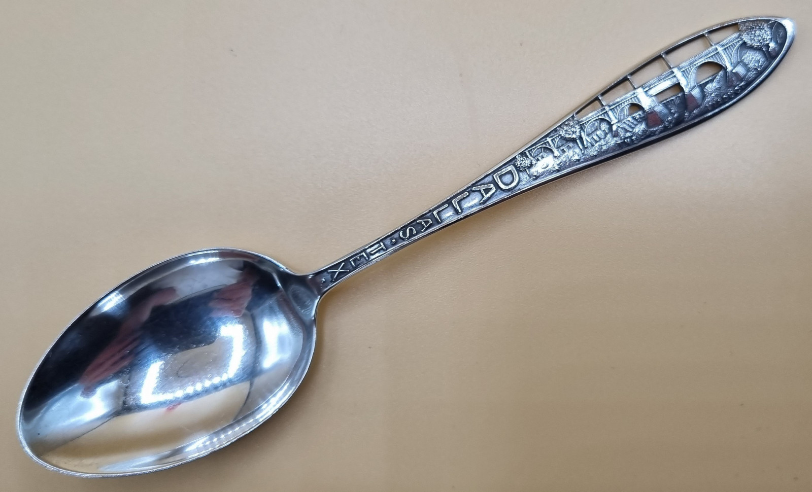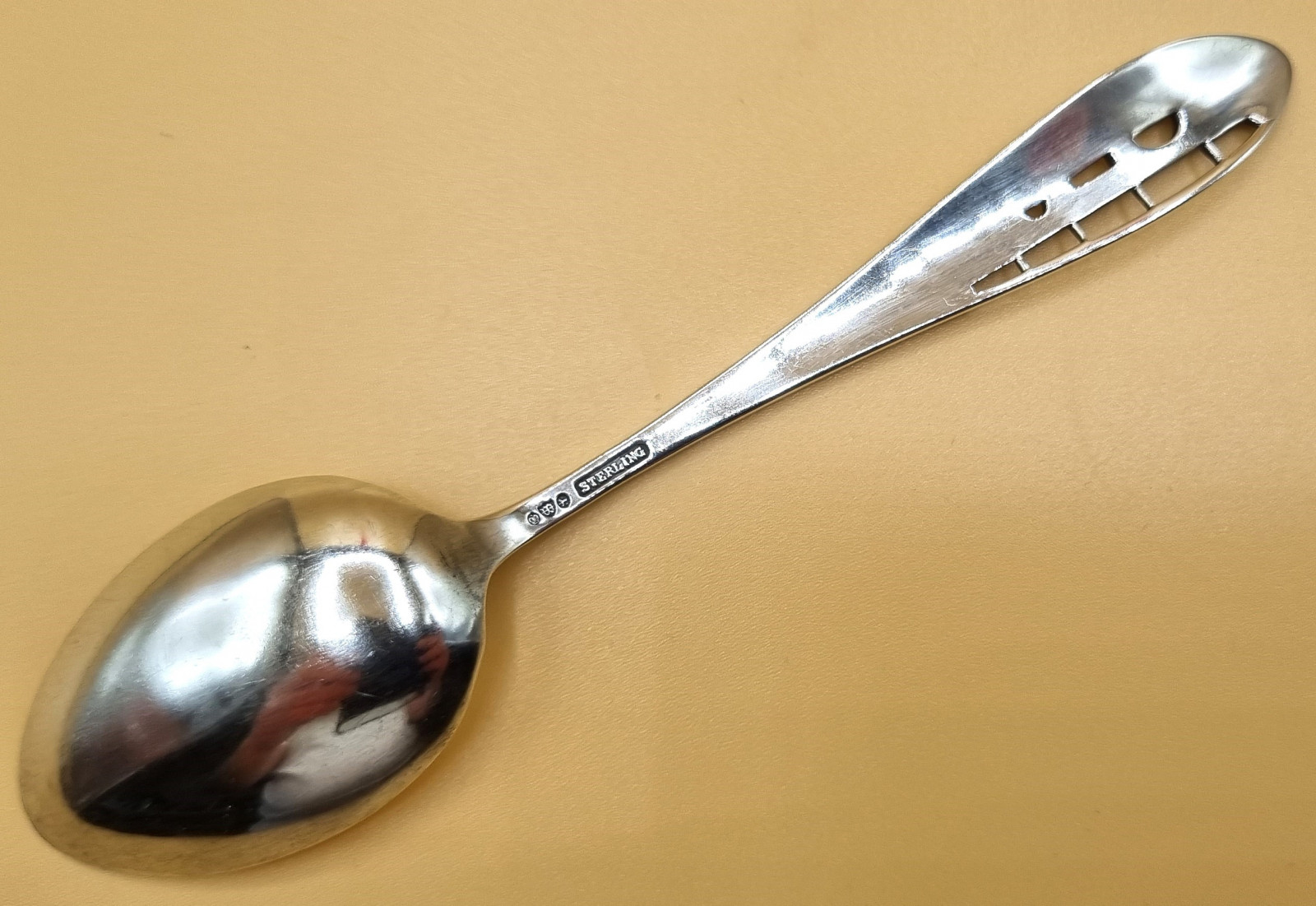 Sterlingsilber, schön verzierter und durchbrochen gearbeiteter Stiel, oben bezeichnet "The Viaduct", am Stielende bezeichnet Dallas Tex., rückseitig gepunzt Krone, W und ein weiteres Zeichen sowie Sterling. Sehr gute altersgerechte Erhaltung, minimale Alters- und Gebrauchsspuren.
