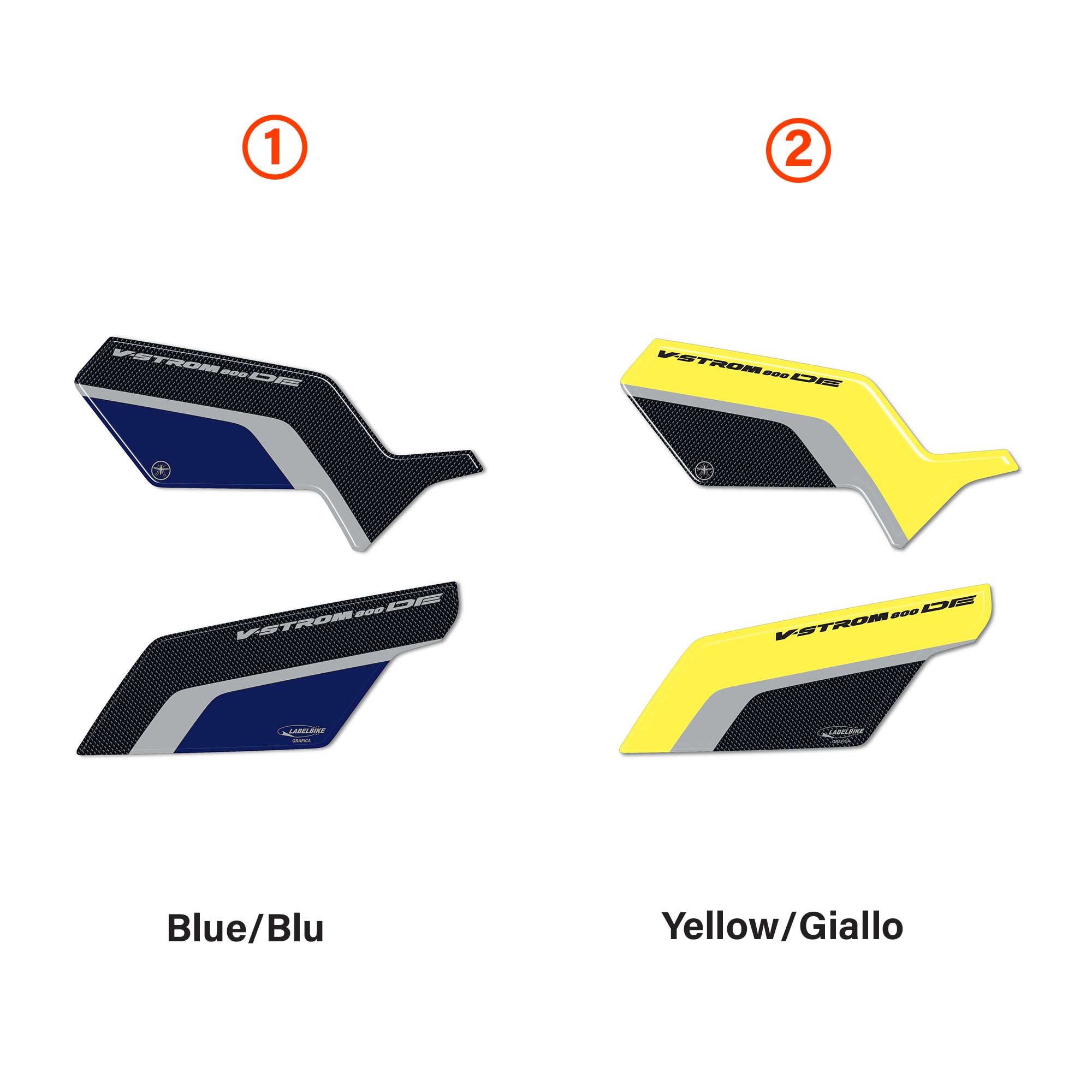 Adesivi battitacco pedane poggiapiedi moto realizzati in resina con effetto 3D. Coppia per lato destro e sinistro di protezioni adesive resinate con grafica in Giallo o in Blu e scritta V-Strom 800DE.