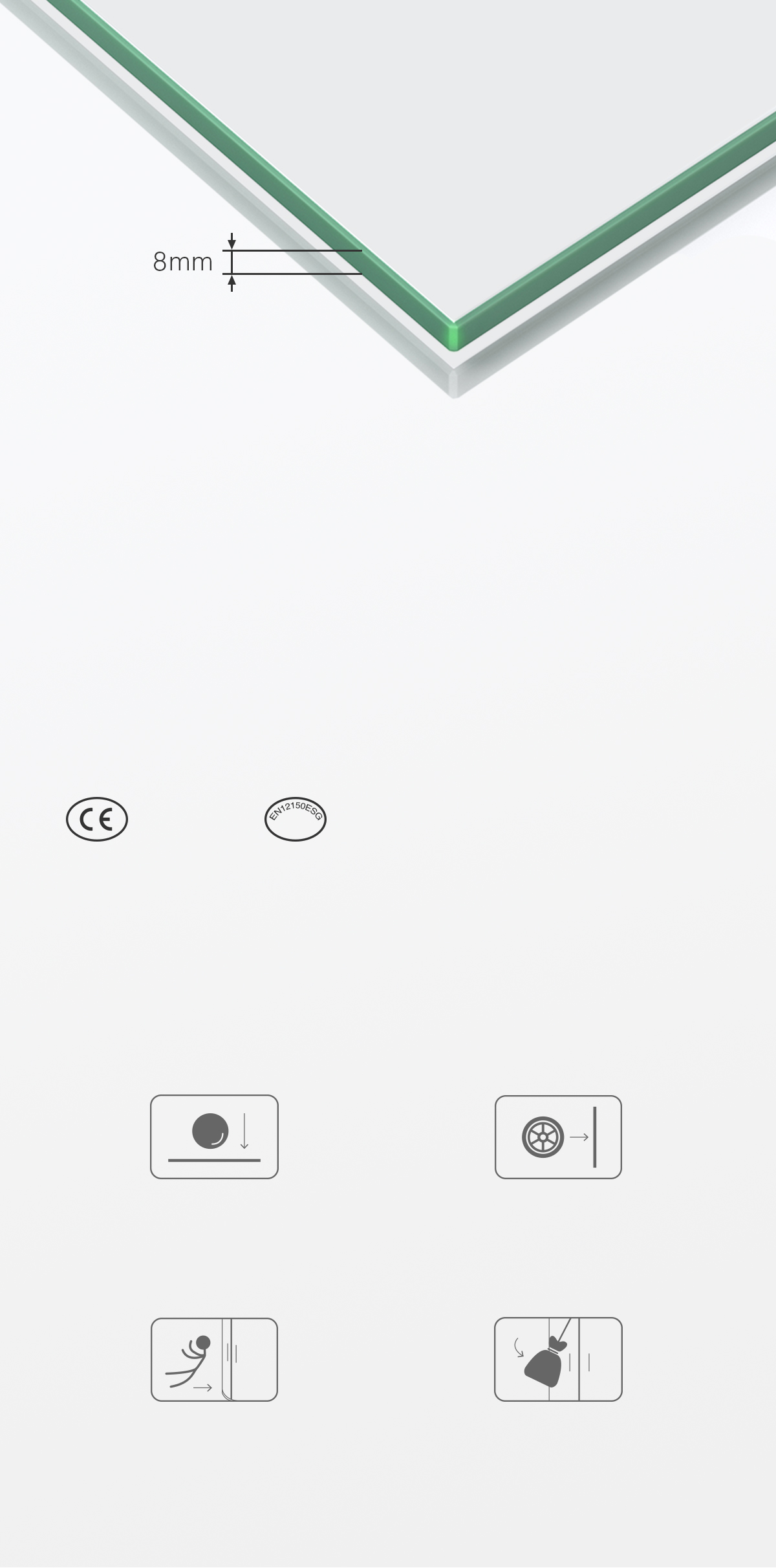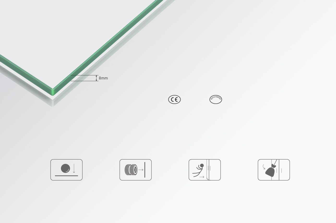 • Nach DIN EN12150 geprüftes Einscheibensicherheitsglas(ESG), 8mm Glasstärke.