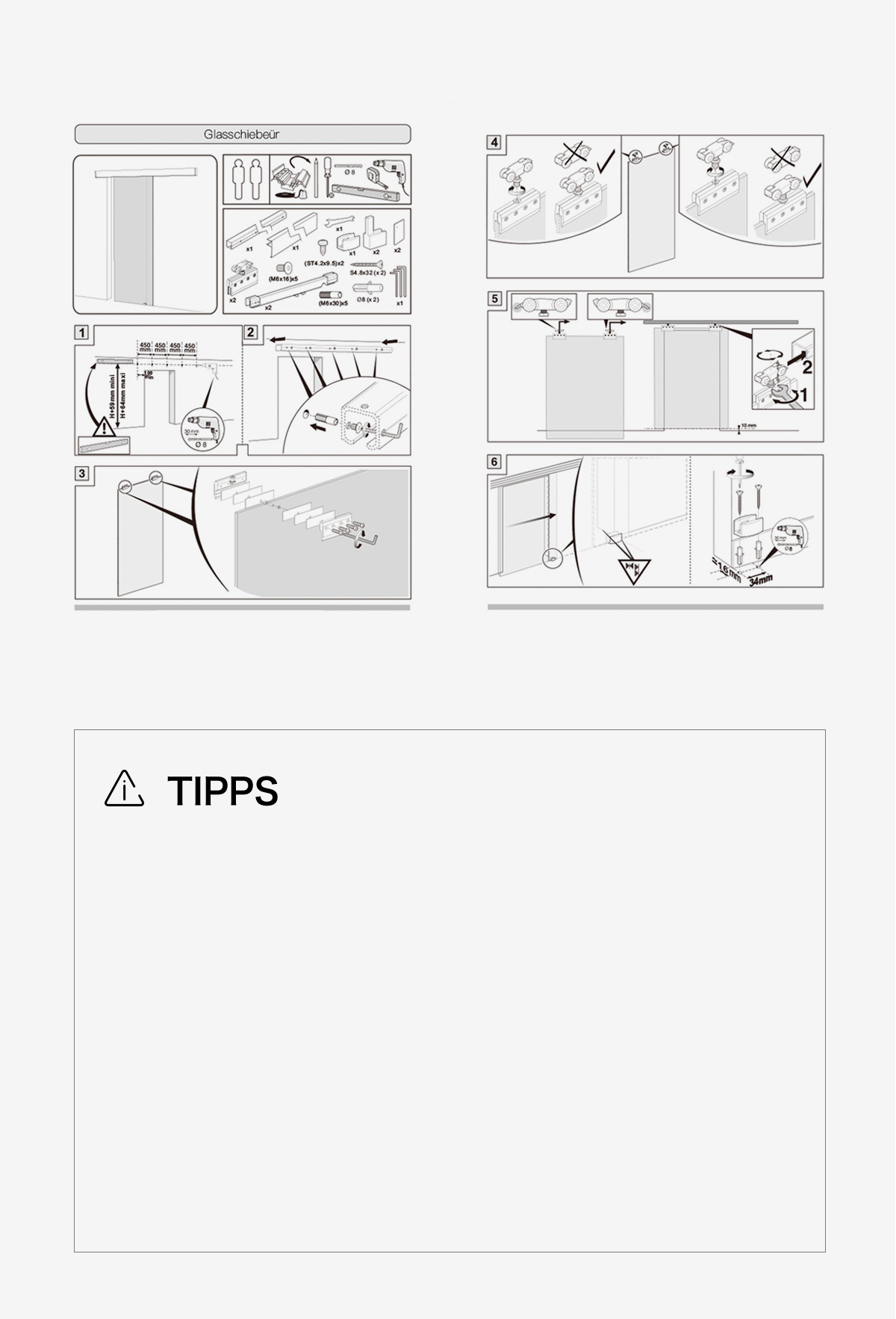 Bei vorhandener Türzarge können die Laufschiene bauseits mit 4 Distanzprofile unterfüttert werden. Der Abstand zwischen Tür-Blatt und Wand erreicht dann ca.10mm.
