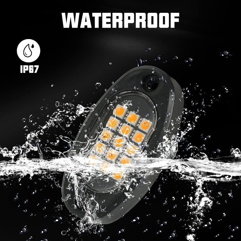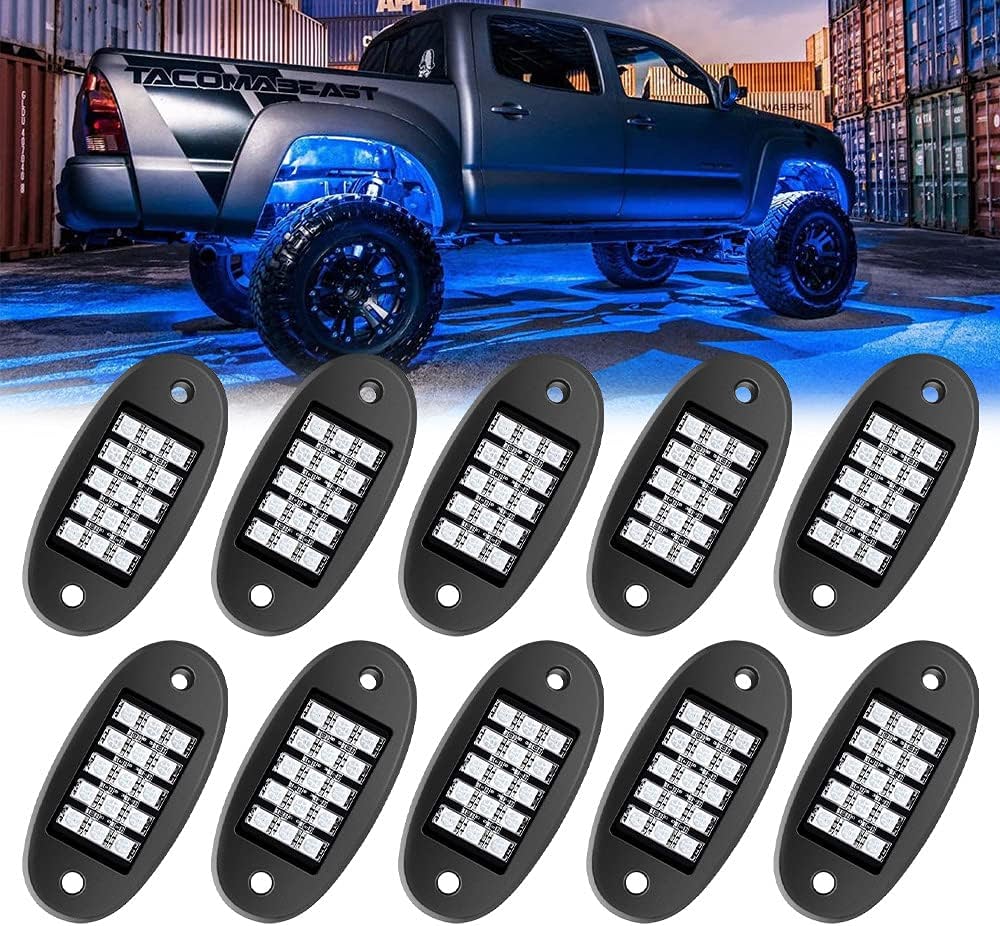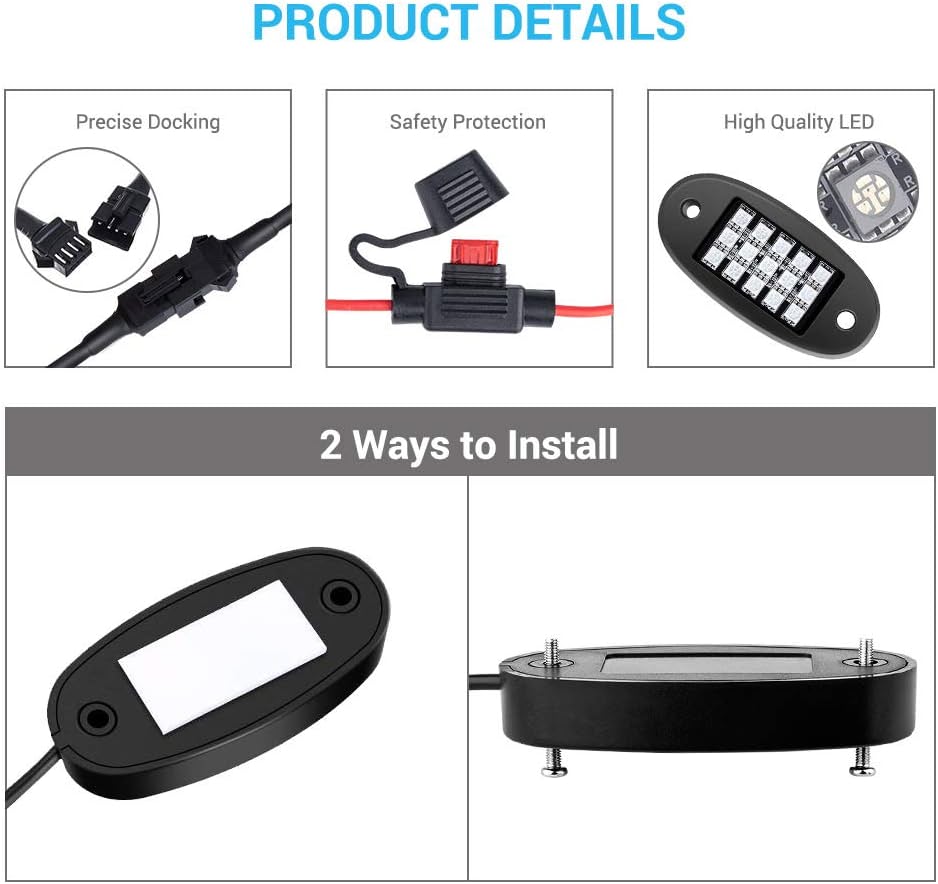 ➤3 Control Modes: 4 keys & 24 keys remote control, APP control to avoid connecting issues, which you can adjust the change speed, brightness and stroboscopic speed. You can control the rock lights with 3 control modes. ➤IP68 Waterproof: IP68 waterproof, dust-proof & rust-proof construction, driving through any heavy rain or harsh snow weather. We test the neon lights under the water for 3 hours consecutively and they all work well. Please pay attention to the waterproof of the controller, please do not expose it to the outside. ➤ RGB Multi-colors & Music Mode: After you install the APP, you can choose 16 million of colors, each pod can shoot super wide-angle lights up to 150 °. The rock lights kit will follow the rhythm of your music to glow, including slow, relaxing tunes and dance music. ➤10 Pods With High Quality Chip: Rock lights kits have 15 SMD beads, more than the other rock light kits. High quality led chip, provide brighter lights and low energy consumption. ➤Widely Application & Warranty: Rock lights kits can be widely used in car, off road, truck, ATV, UTV, SUV, ATV motorcycle, boat and so on, also used for interior, dome, neon lights, yacht lights, ect. 2 Types of Mounting included, drill or no drill.