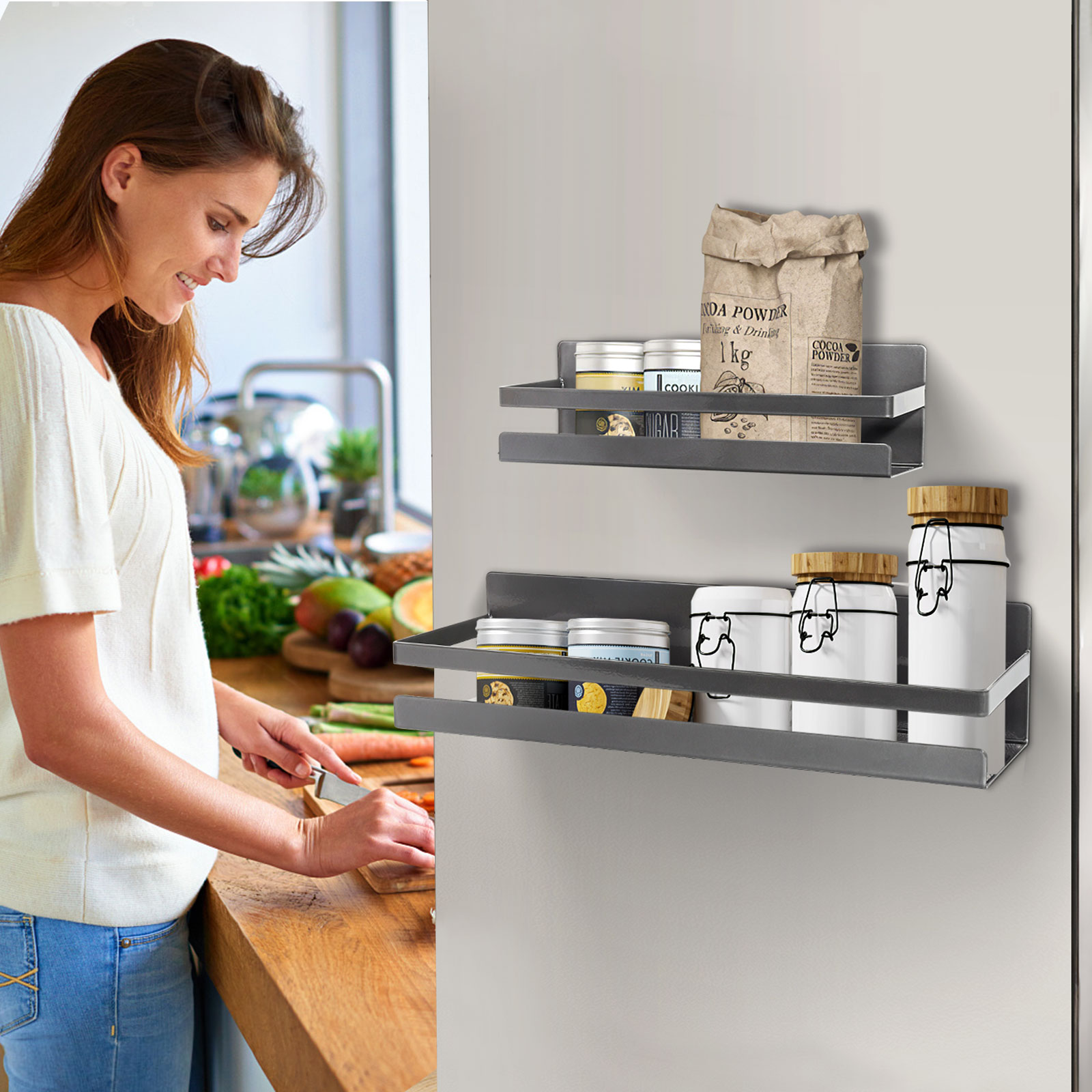 The magnetic spice rack for refrigerator is definitely a fantastic spice organizer, which perfectly gets clutter off of your counter tops to free space. This magnetic shelf organizes all of your seasoning jars and kitchen supplies well on spice shelf, and keeps your kitchen tidy.