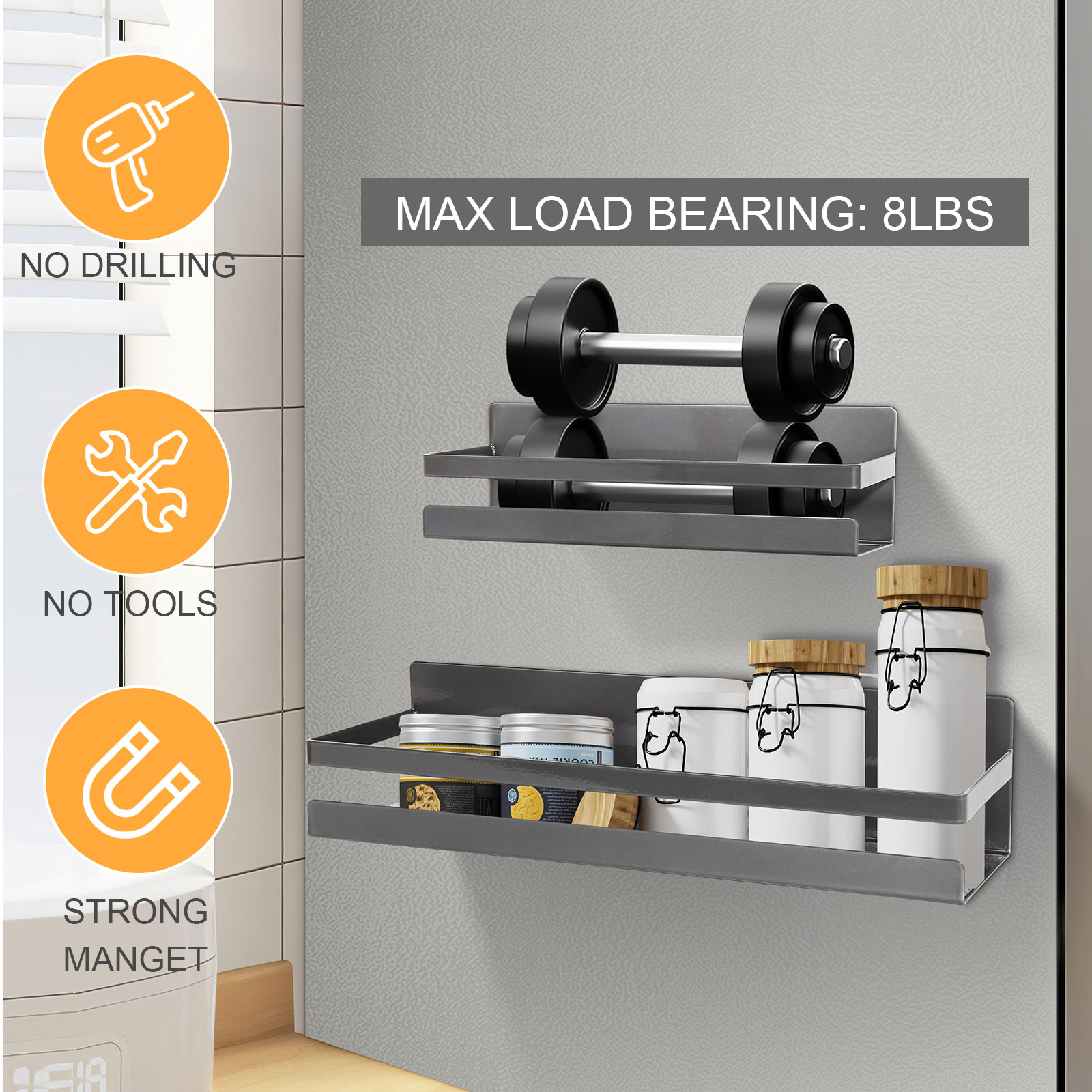 Not just for the refrigerator, these magnetic shelves are also suitable for washers, microwave, stoves and other iron surfaces, the magnetic fridge shelf is large and strong enough to hold multiple household supplies and help you free up more spaces. And this rack also can be used as a magnetic book shelf for whiteboard in classroom.
