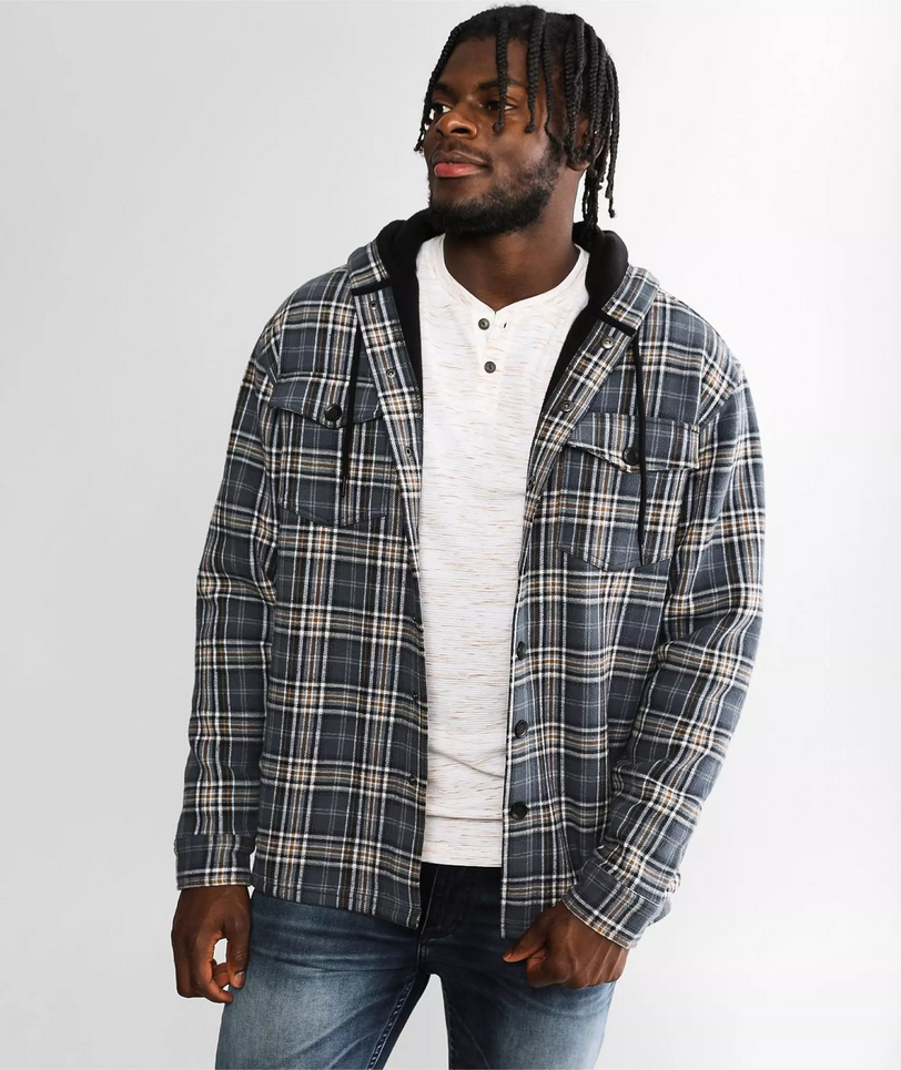 Details: This jacket is the perfect transition piece as the temps start to fall. Everything you love about Departwest, now in outerwear. Plaid snap front fleece lined jacket. Drop tail hem. Chest flap pockets. Hood with drawstring.