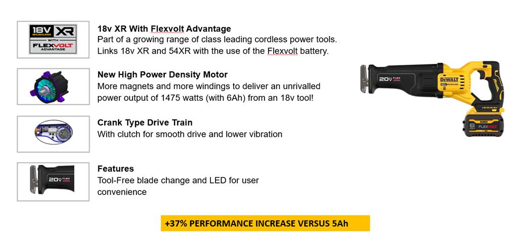 Dewalt 18v XR tools featuring Dewalt Flexvolt Advantage technology include a brand new electronic module which recognises Flexvolt batteries to deliver more power than with standard 18v XR batteries. The Flexvolt Advantage machine can then draw more current and adjust the power output accordingly. This means that when you use a high performance XR FLEXVOLT battery pack with a FLEXVOLT ADVANTAGE tool, as opposed to a standard 18v battery, you get much more power! These new machines also include new brushless motors with stronger magnets and increased copper in the outer windings.