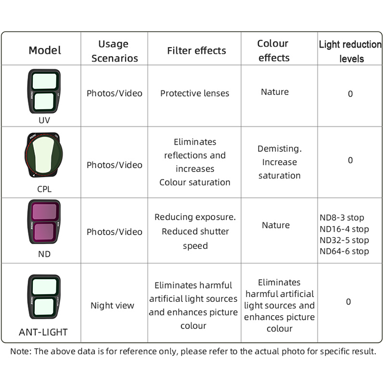 l Types (Optional): UV, CPL, ND8, ND16, ND32, Anti-Light, UV+CPL+ND16 33PCS Set, ND8/16/32/64 4PCS Set, UV+CPL+ND8/16/32/64 6PCS Set