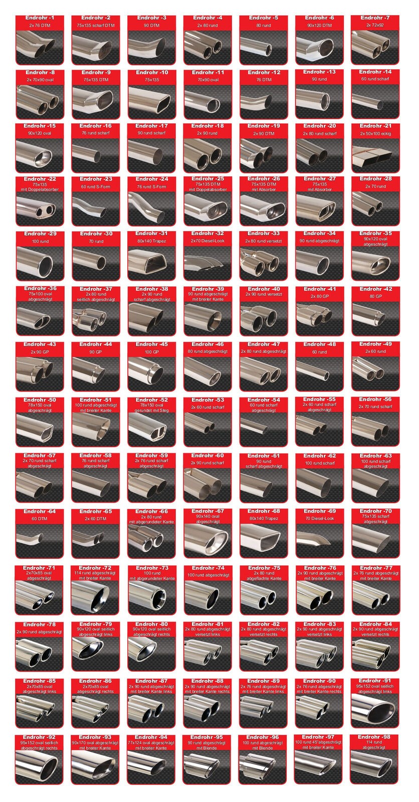 Bitte die Nummer des Endrohres, welches von Dir gewünscht wird, im weiteren Bestellprozess angeben. Dies kannst Du im Schritt nach dem Warenkorb über den Link "Nachricht hinzufügen" machen. Das ist die Seite in der die Lieferadresse und die Zahlungsmethode nochmals dargestellt wird. Du kannst uns auch eine E-Mail mit Deinem eBay-Usernamen und der Nummer des Endrohres zusenden. Durch die Auswahl des Endrohres entstehen keine zusätzlichen Kosten. An dieser Stelle bitte auch Deinen genauen Fahrzeugtyp angeben.