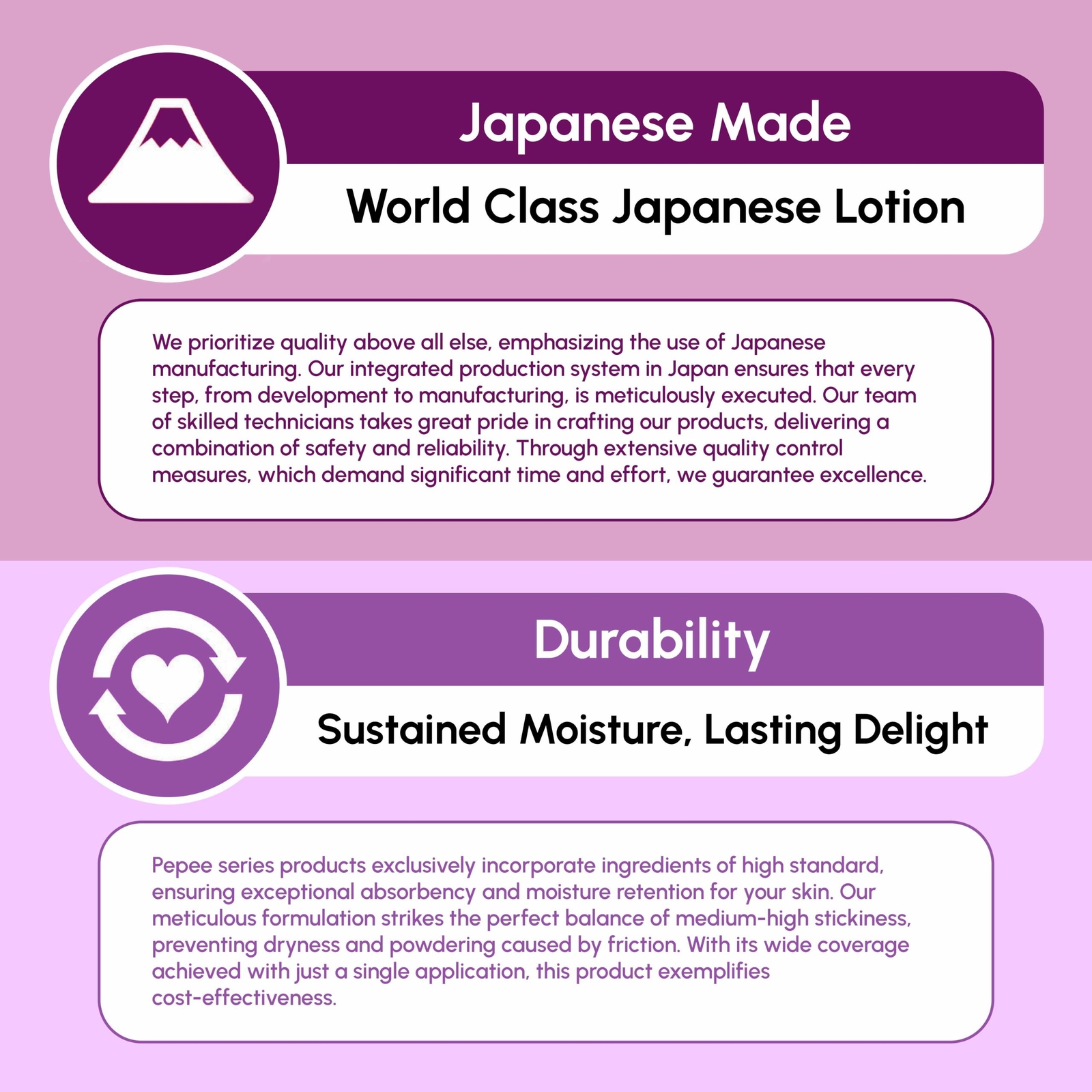 - Made In Japan - All PEPEE lotions are proudly made in Japan with premium ingredients and excellent craftsmanship, perfect for a pleasurable experience.