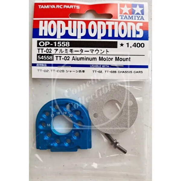 Genuine Tamiya Hop-Up TT-02 Aluminum Motor Mount Blue OP-1558 #54558 in factory sealed retail package.