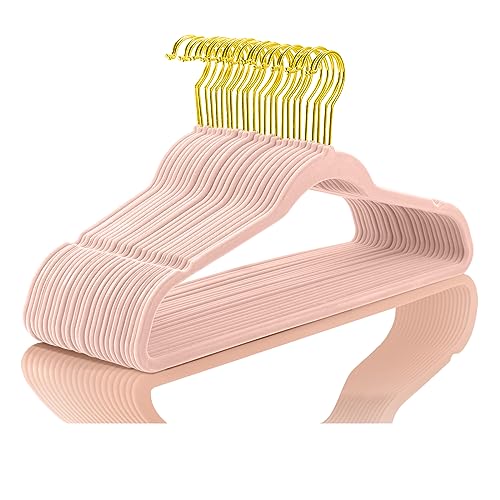 brings you Luxurious Design High Quality Heavy Duty Non-Slip Velvet Hangers at an Affordable Price! Supreme Quality Combined Thicker and Stronger Standard Velvet Hangers. These Premium Velvet Hangers (Pack of 60) Heavyduty - Non Slip - Velvet Suit Hangers Blush Pink Gold Hooks,Space Saving Clothes Hangers by help you saving more half the closet space compared to wood or plastic. They have can hold suits and outerwear securely with its heavy duty strength. Key Features: * These hangers measure 17.5"x0.2"x9" inches and come in our beautifully designed box for easy transport.With Top Quality Material: ABS Plastic, Nylon Flocked,Rose Gold Hook * Ultra slim & lightweight design for space saving * Non slip and luxurious velvet material * Holds heavy winter coats easily * Can hold large capacity from 5kg to 8kg(11lbs to 18lbs) * Conserve a tremendous amount of precious closet space * Swivel Gold Hooks can be 360 degree rotated * The gentle curves Notched Shoulders of the hanger preserve the shape of your clothing, unlike regular hangers The set makes a great gift! With this pack of 60 velvet hangers with Gold finish, Premium Velvet Hangers (Pack of 60) Heavyweight - Non Slip - Velvet Suit Hangers Blush Pink Gold Hooks,Space Saving Clothes Hangers by , you can replace all your regular hangers at once. Perfect for dresses, suits, shirts, skirts, trousers & more. NOTICE : Please be sure to purchase the right hanger color and hook color you . Package Includes: 60 x Velvet Hangers ★★★★★ RECOMMENDED BY MANY HAPPY CUSTOMERS★★★★★ "These velvet hangers are very sturdy. No more clothes slipping off the hangers with the plastic hangers! " Irik