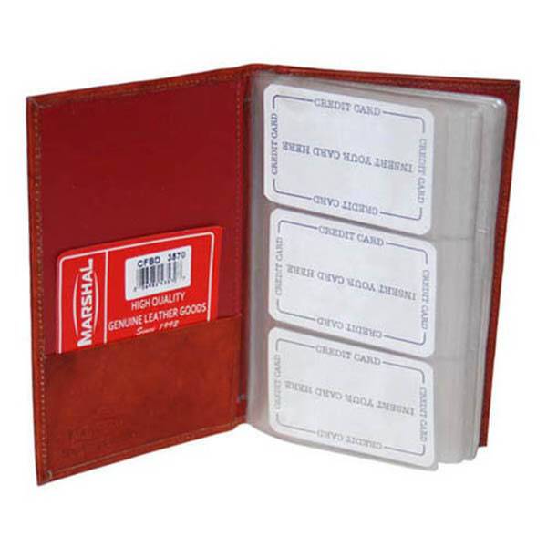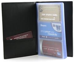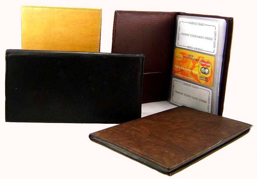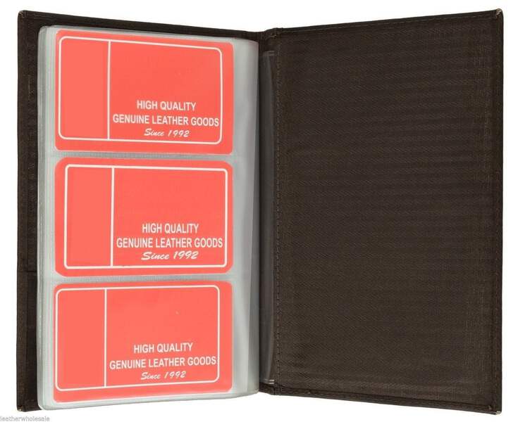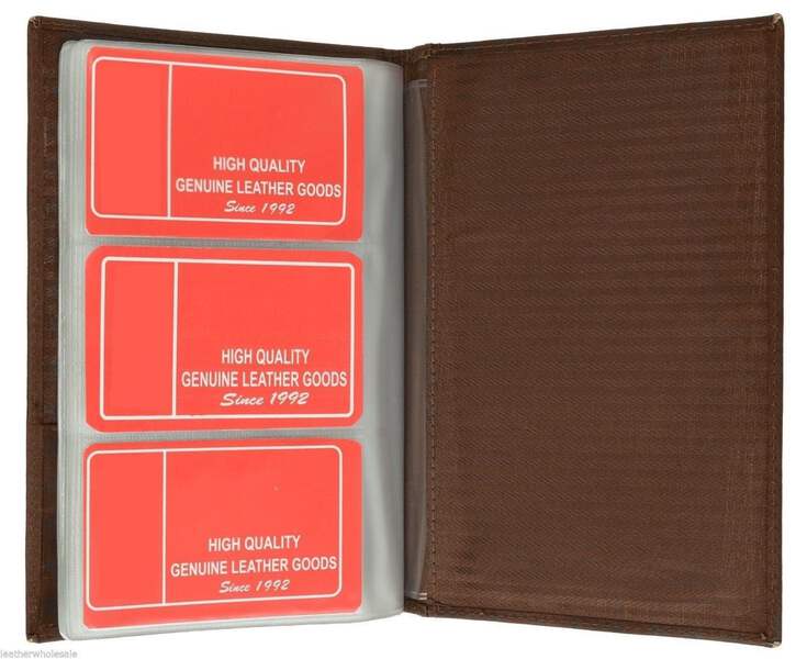 Genuine Leather 120 Business Card Organizer Cowhide Wallet Men Women Features: Material: Genuine Leather Bi-fold Size: 9" x 7" 60 plastic inserts to fit 120 business cards (holds up to 120 paper business cards (or alike) front and back) Other features: Leather folder with plastic triple credit card slots