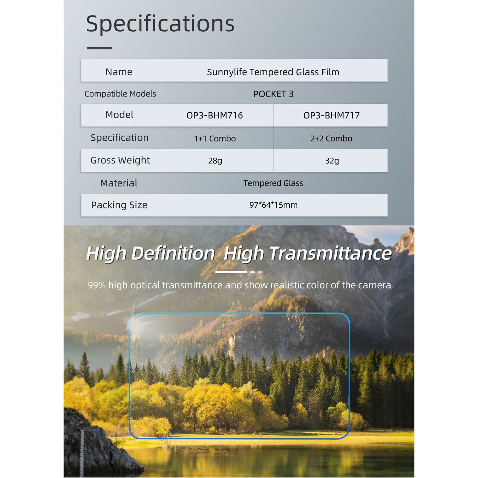 l High-definition and high-transparency, no loss of picture quality, 99% high transmittance, clear reproduction of the camera's rich colors
