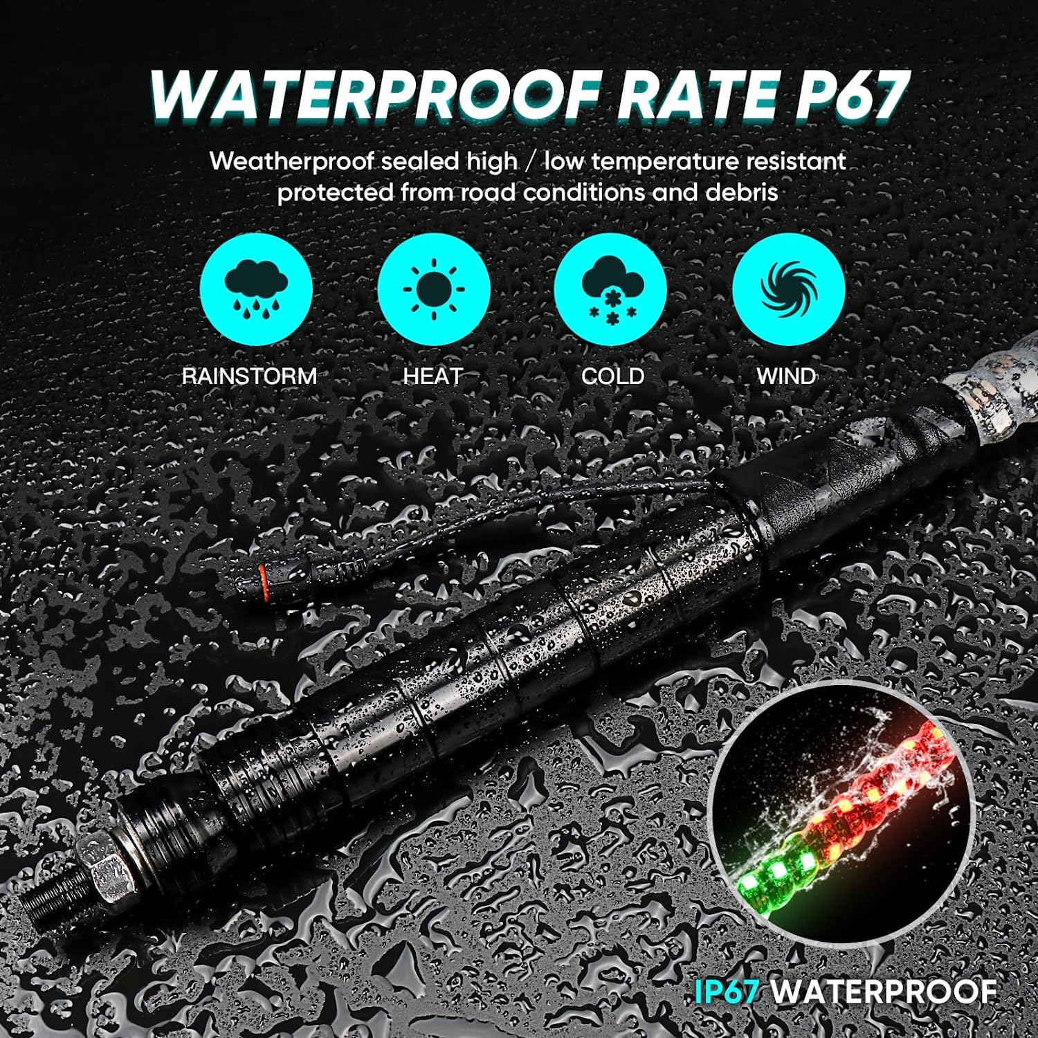 【IP 67 & Durable】The LED whips/neon rocks lights are Waterproof IP67,covered by EVA transparent heat shrink tube and silicone, and protect the LED chips from water and dust. It features the enhanced shockproof mechanism and an updated base, which improving products durability and protecting the from mechanical damage.