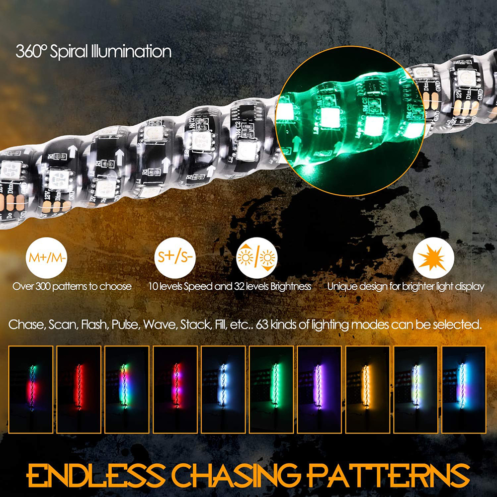 【Safety & Cool Style】Spiral design. Lighted whips glow in 360°direction, light up the night with hundreds of dancing patterns like chase, build-up, strobe, pulse, scan, stack etc and 12 solid colors.