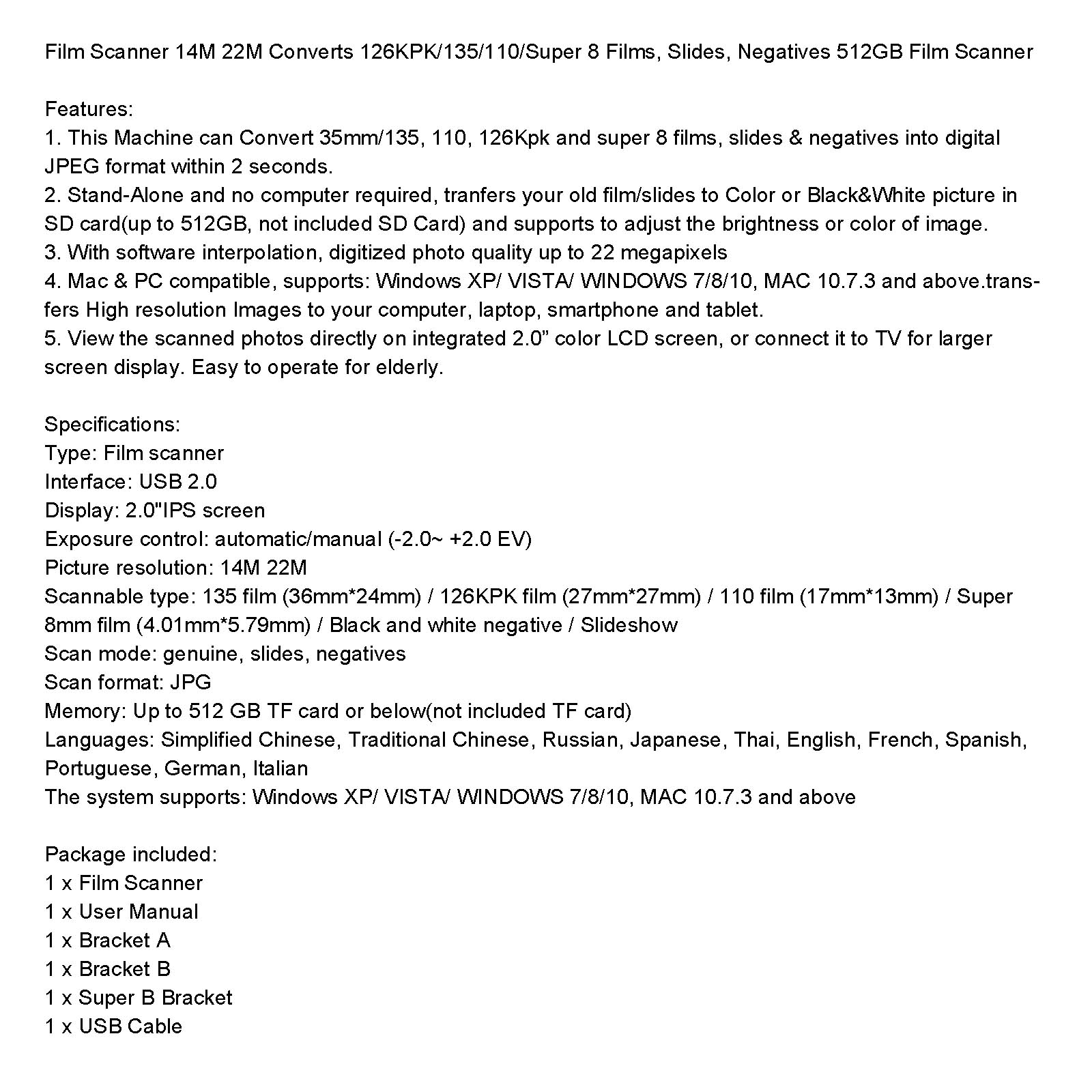 Scannable type: 135 film (36mm*24mm) / 126KPK film (27mm*27mm) / 110 film (17mm*13mm) / Super 8mm film (4.01mm*5.79mm) / Black and white negative / Slideshow