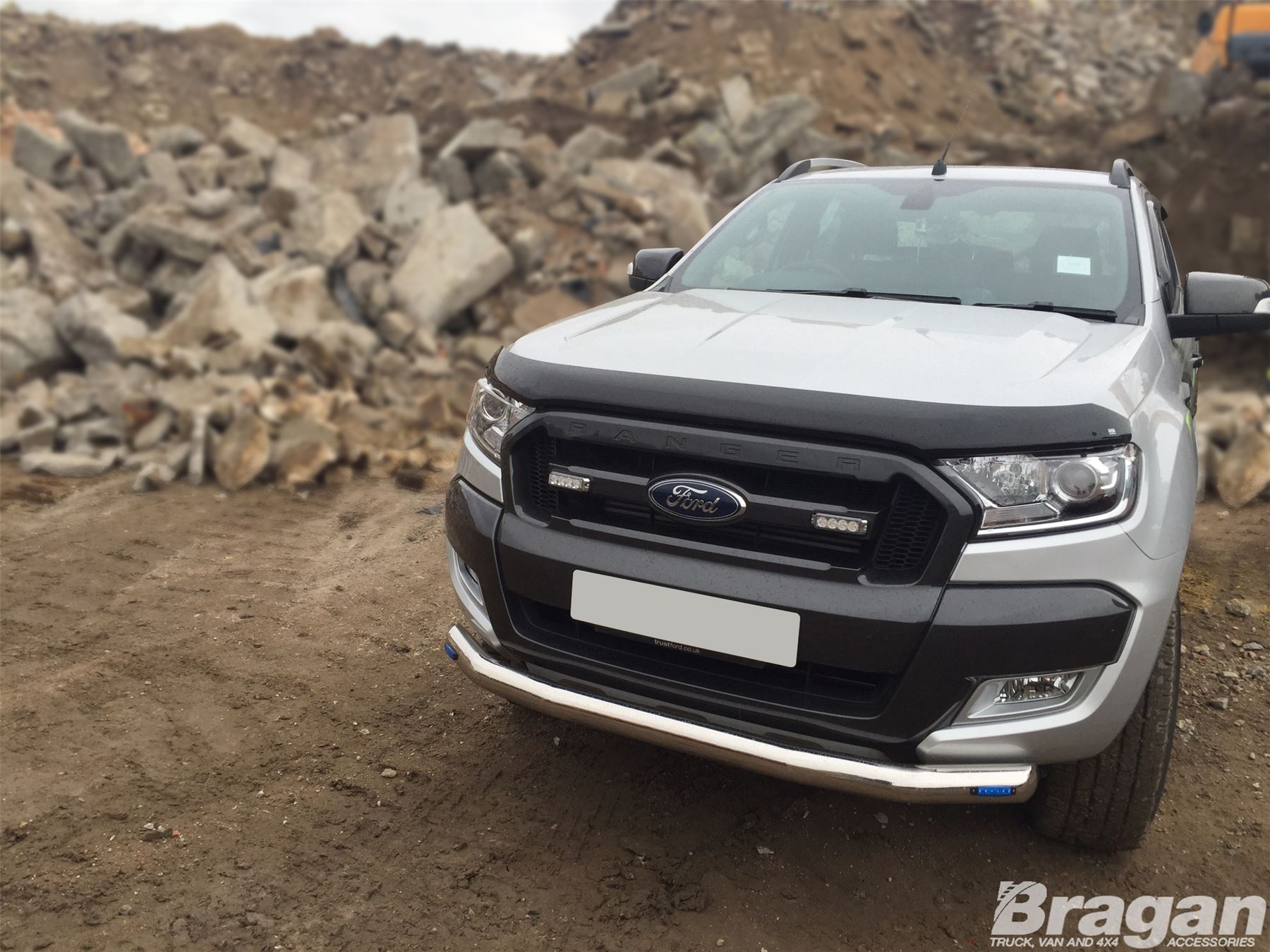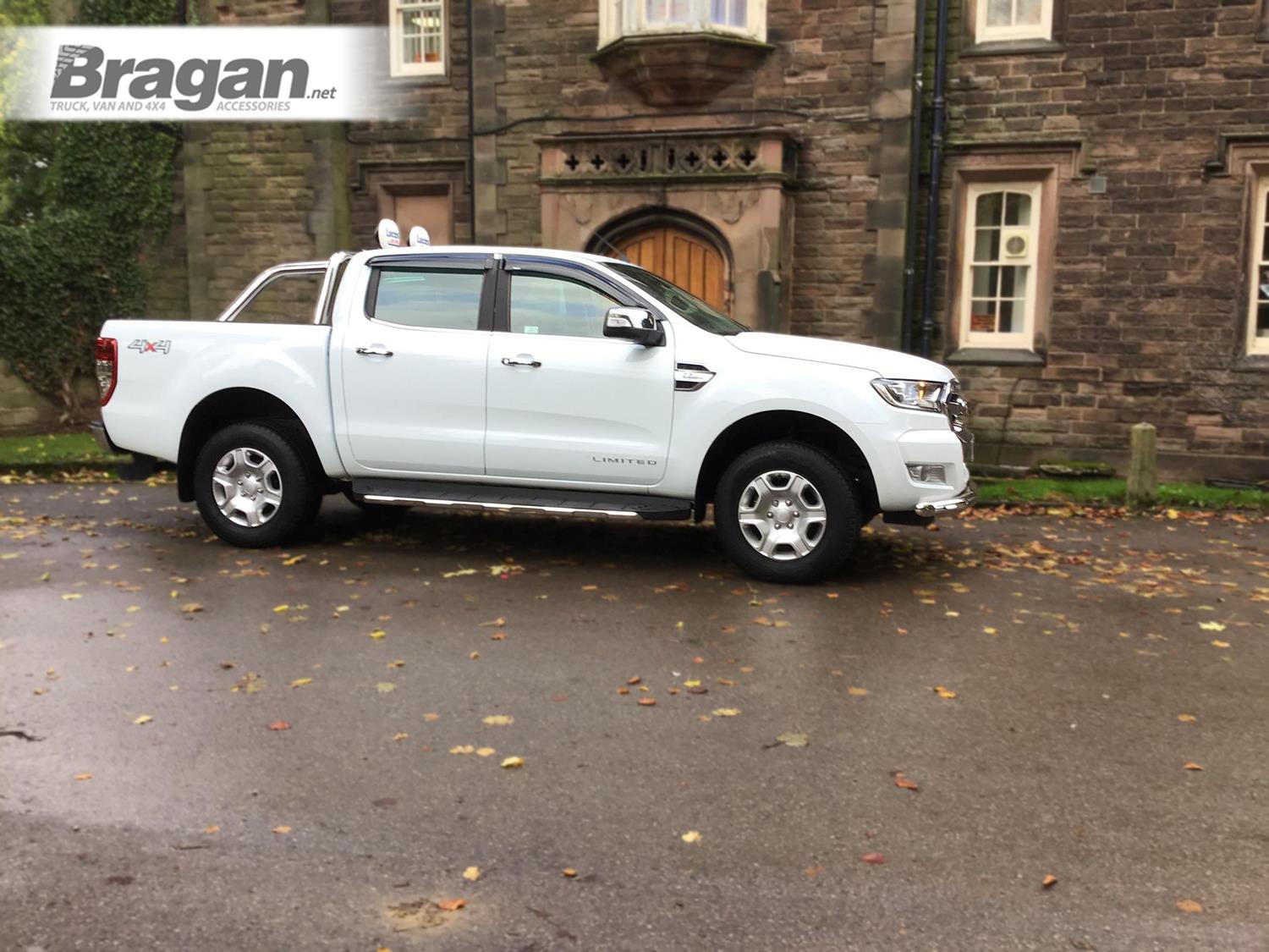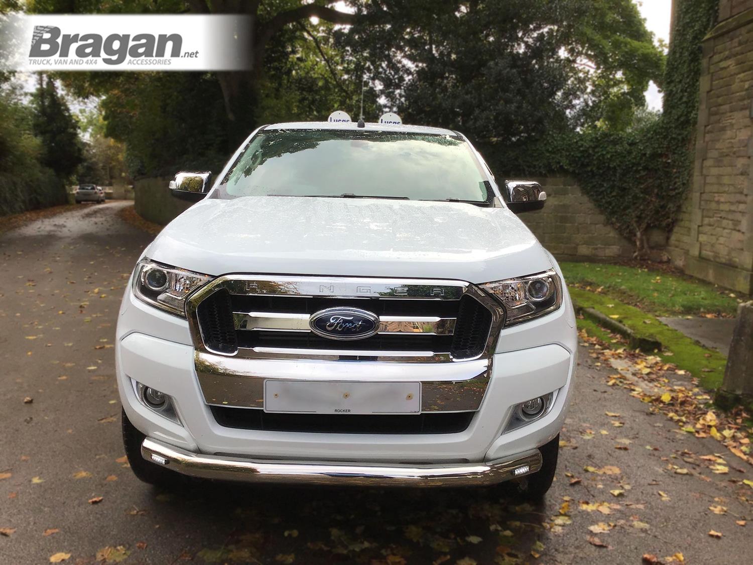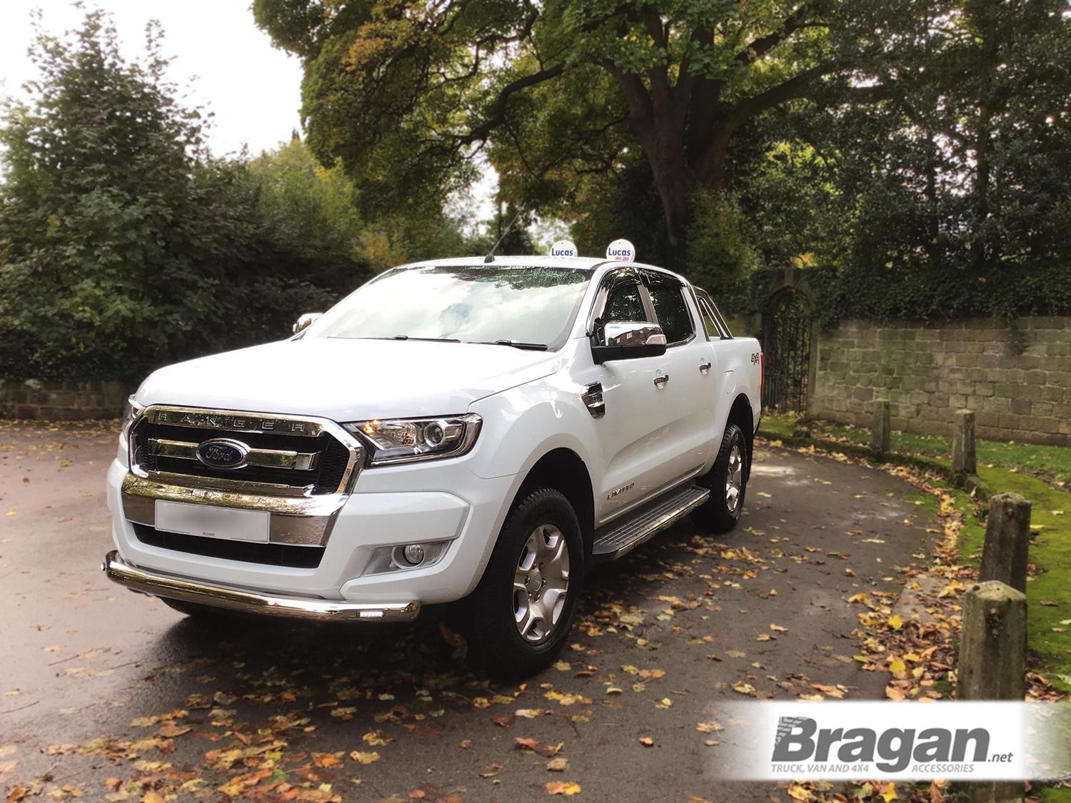 High-quality Stainless Steel Bumper Spoiler Bar with 2x White Slim LEDs for Ford Ranger T6 (2016-2023 models). This top-of-the-range bumper bar will have your vehicle looking top spec at a fraction of the cost of the genuine items but with the same high quality.