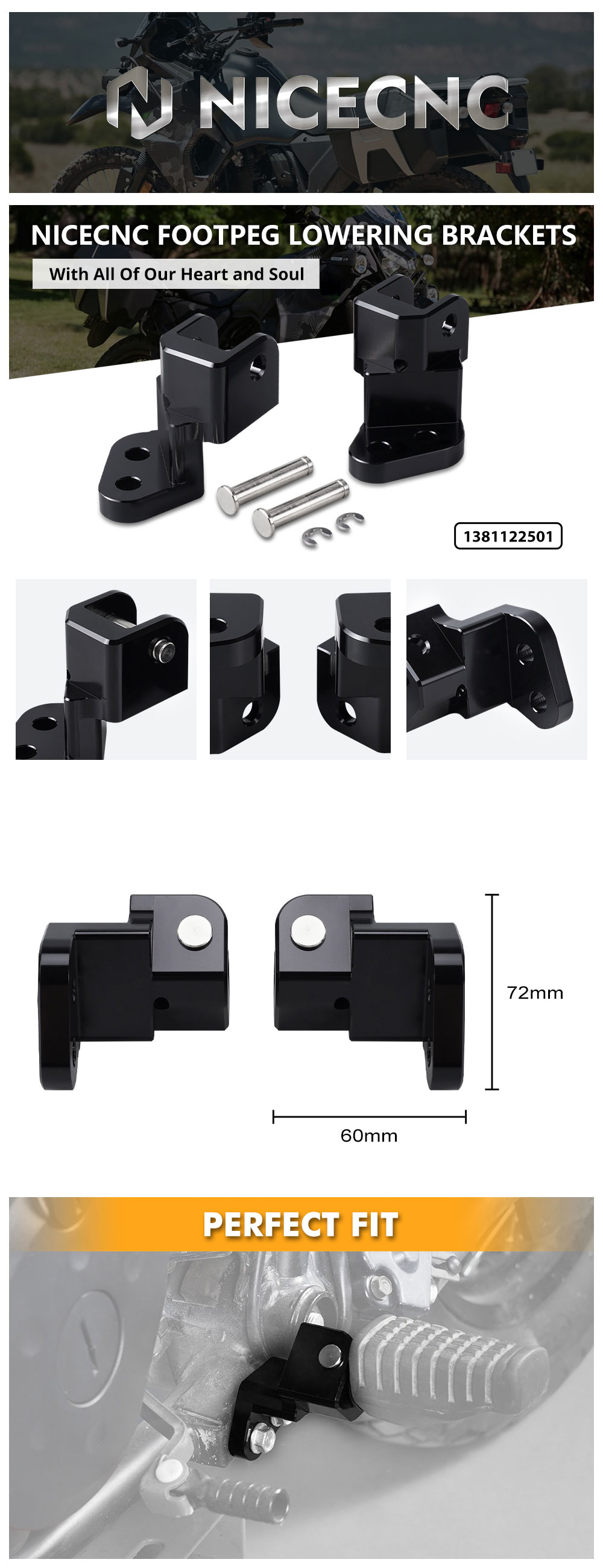 【1" Lowering】This new footpeg lowering kit lowers your KLR650 footpeg position by 1″ (25.4MM),move them to the rear 0.197″(5MM) at the same time,providing greater comfort whether you're cruising on flat roads or riding on rough terrain.
