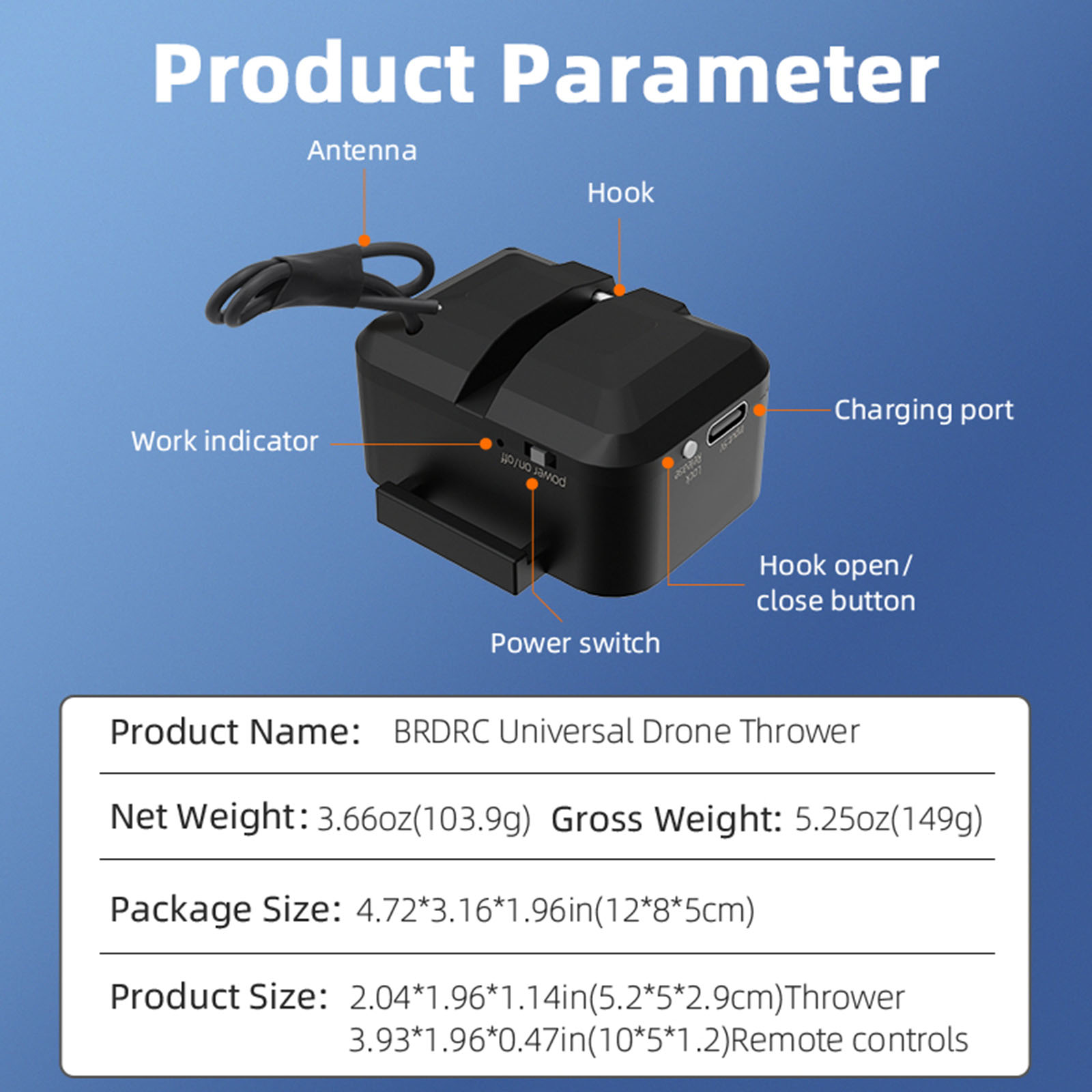 l When charging, it shows "red light", when fully charged, it shows "green light"; When installing the thrower, you should try to avoid blocking the drone's sensors, and it is strictly prohibited to install the thrower on the top of the drone, so as to avoid the hanging objects from being entangled in the propellers. The actual load capacity of the thrower is 1kg, but you need to pay attention to the maximum load capacity of the drone