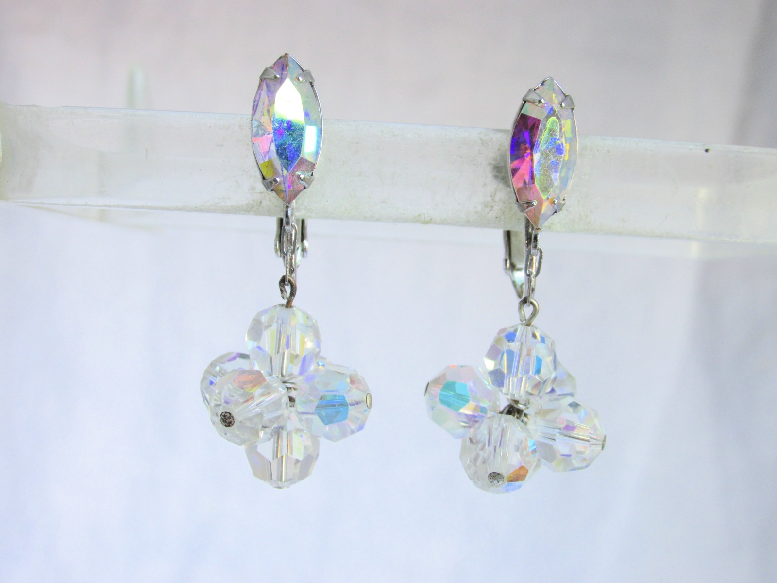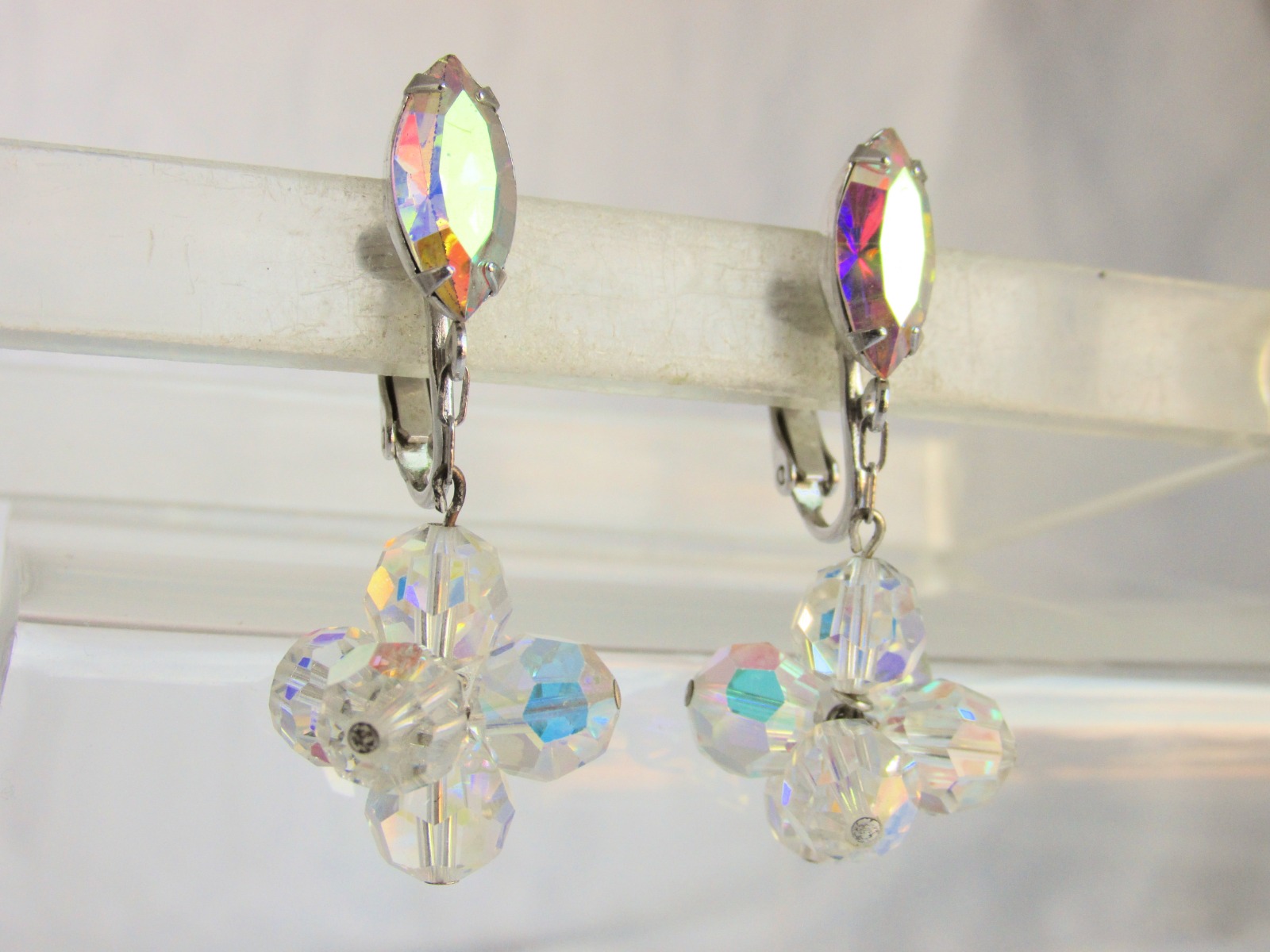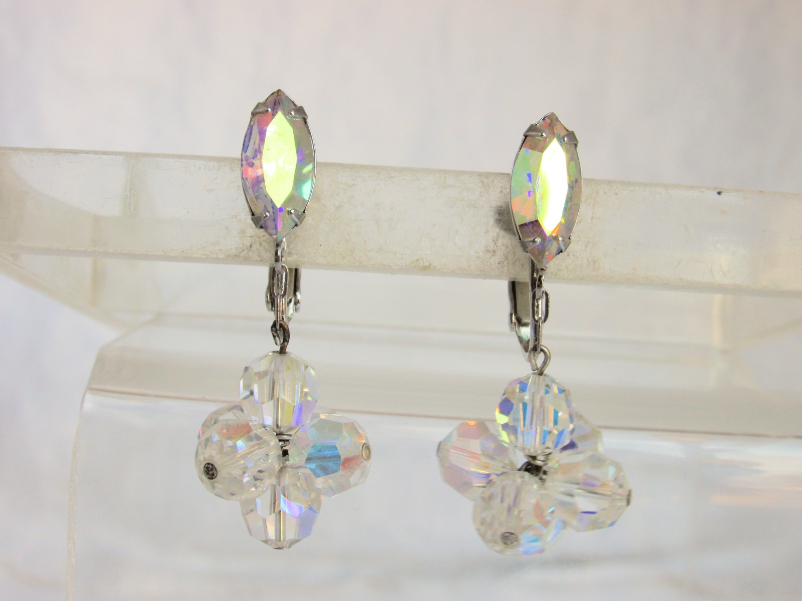 Beautiful vintage marquise AB rhinestone w/ AB crystal ball cluster, swinging on chain, clip on earrings in silvertone.