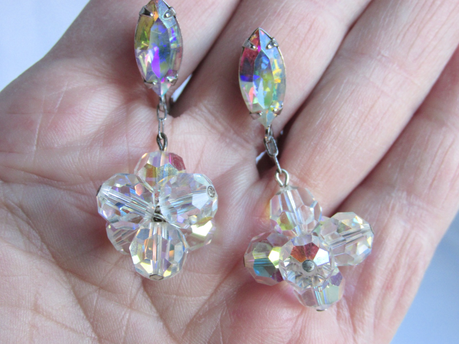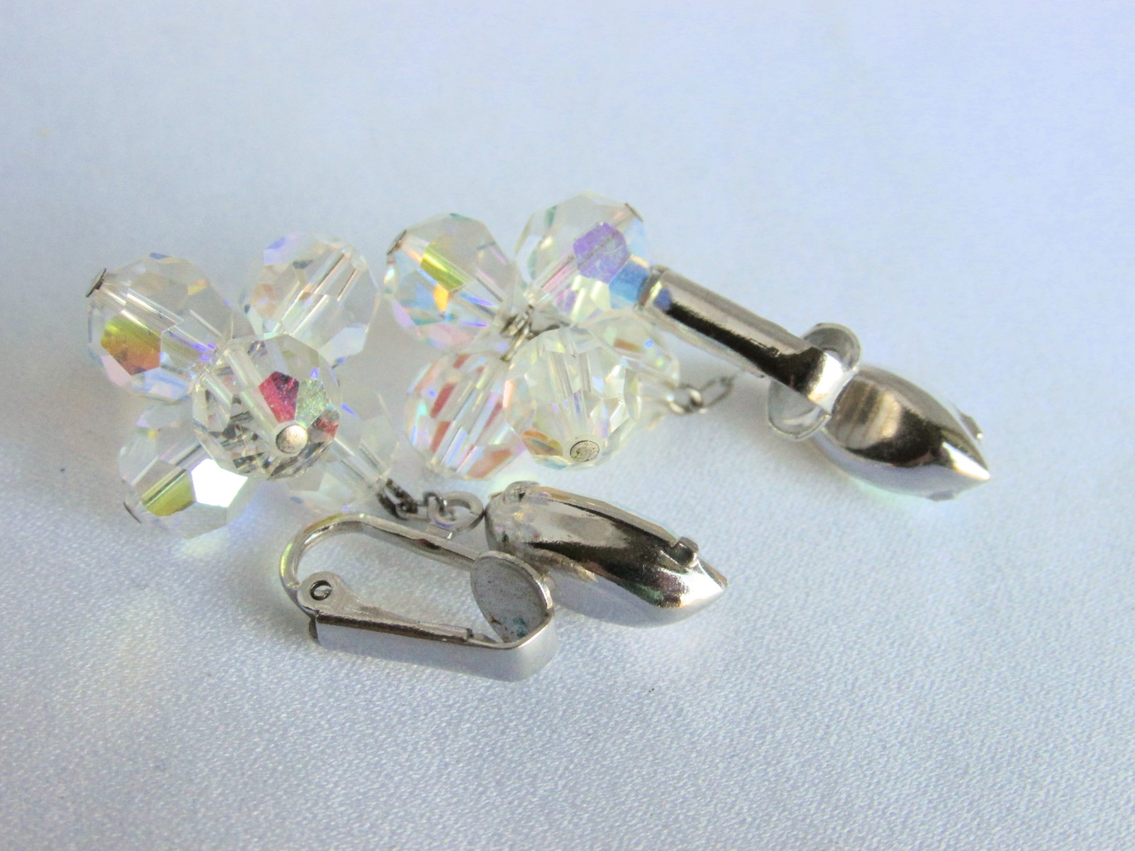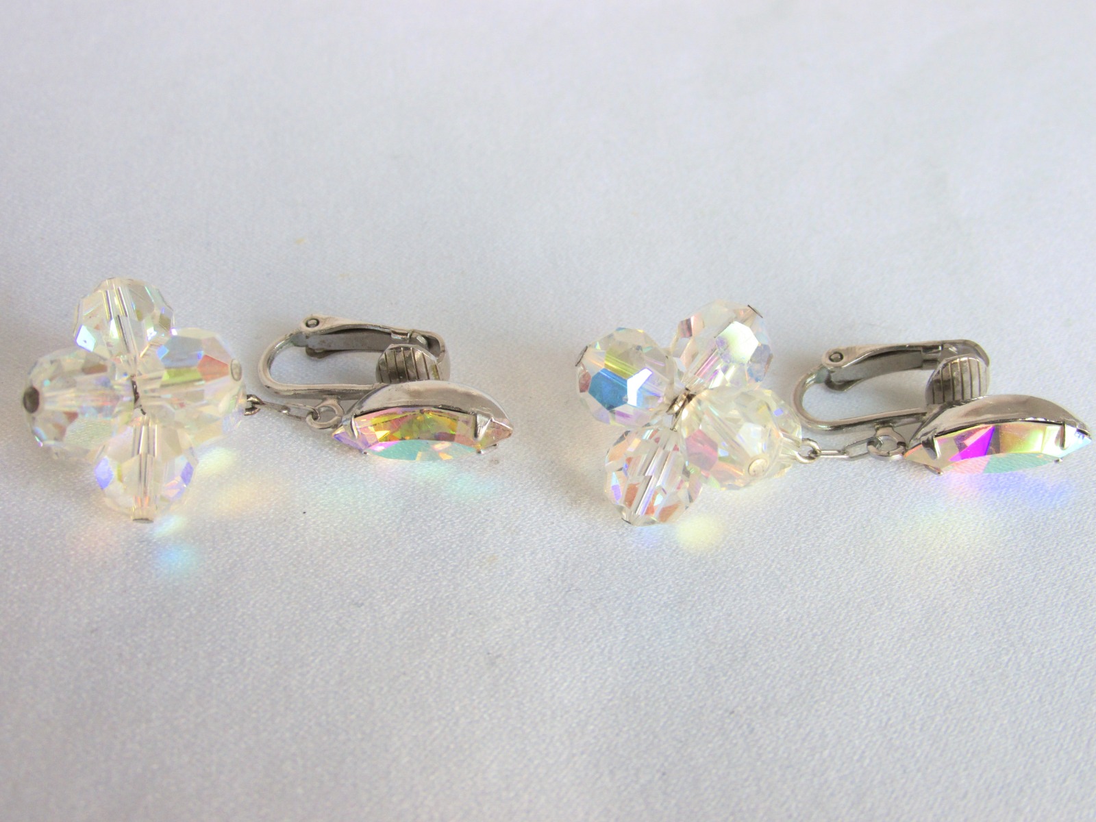 Beautiful vintage marquise AB rhinestone w/ AB crystal ball cluster, swinging on chain, clip on earrings in silvertone.