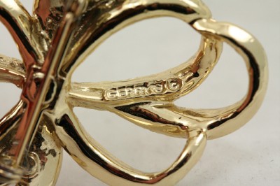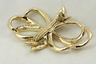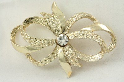 Description: Goldtone metal. Set with a bright clear rhinestone. 2.25" long, 1.75" tall.