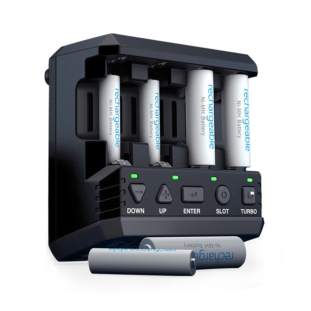 It can handle 1 to 4 AA and AAA NiMH/NiCD rechargeable batteries via four independent charging slots with its respective interface.