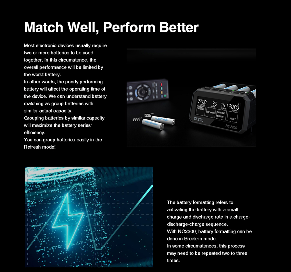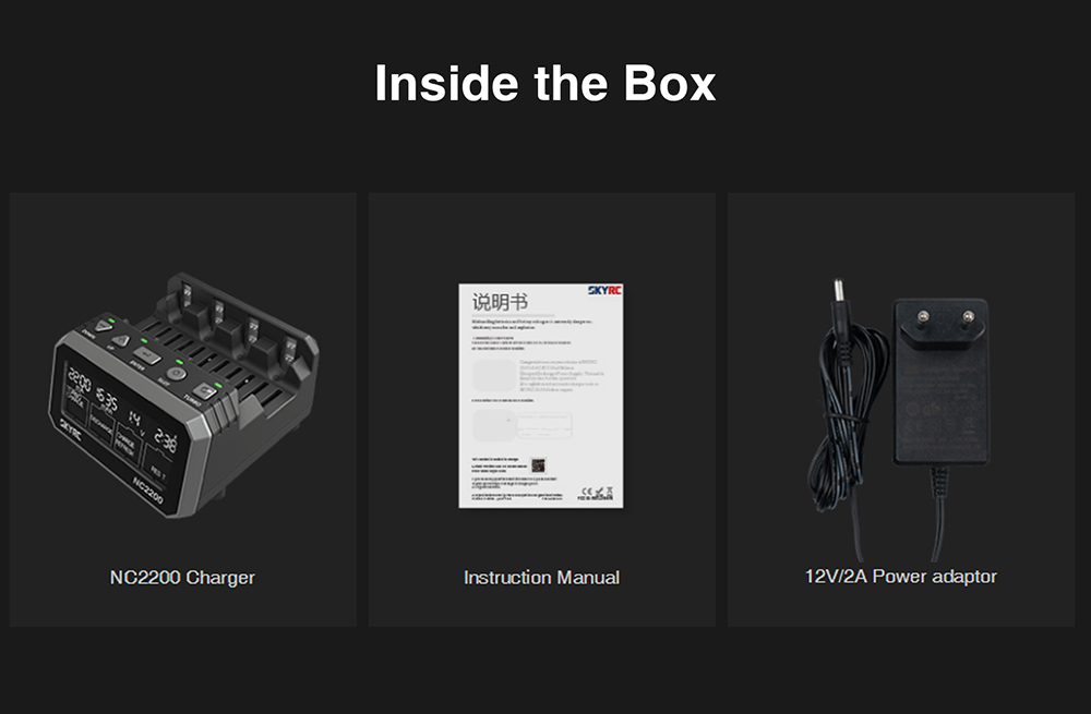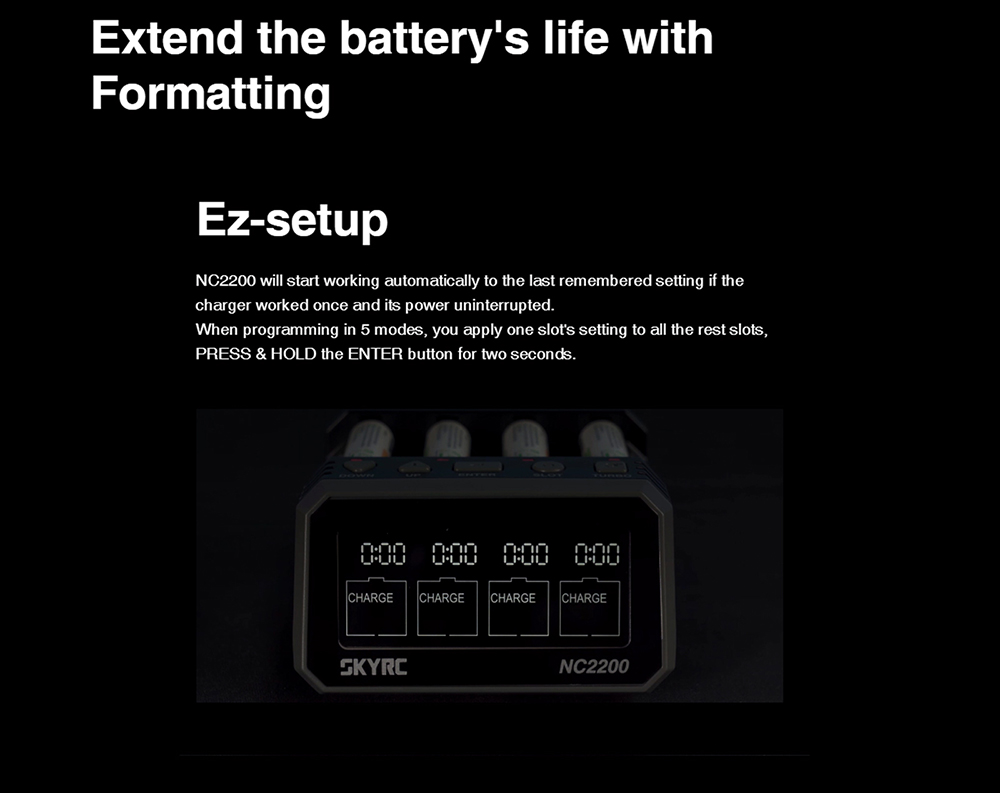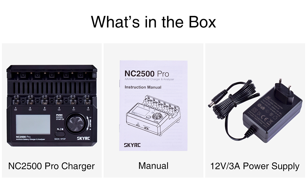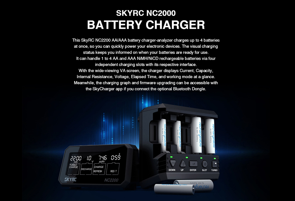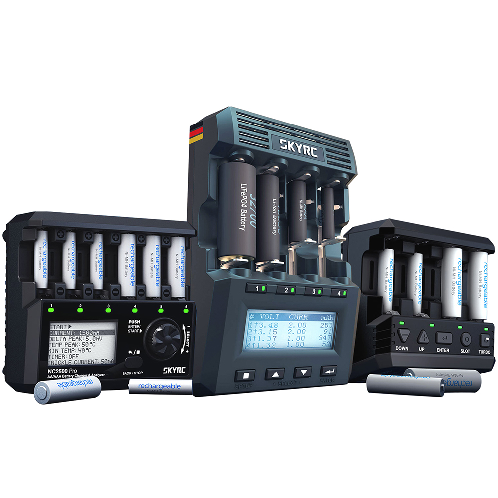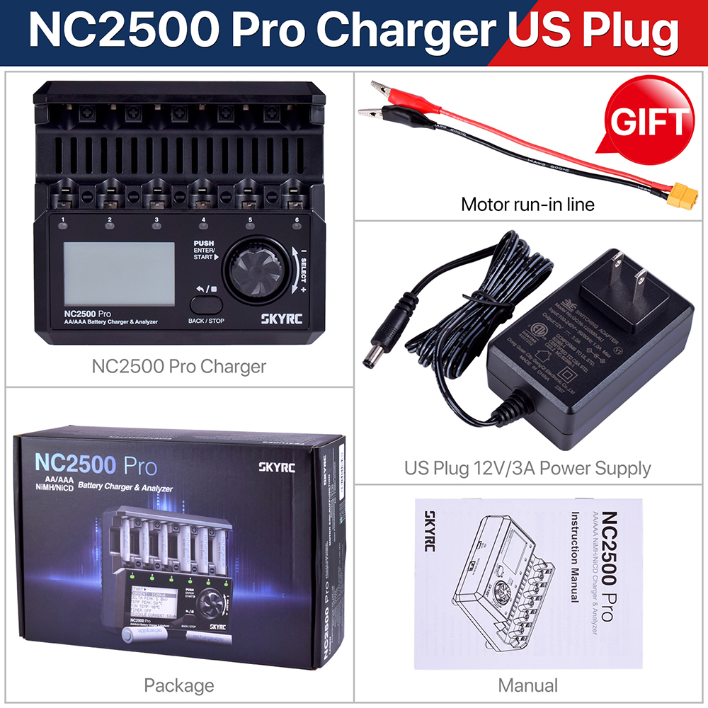 SKYRC NC2500 Pro NiMH NiCd battery charger has six independent slots to charge six AA/AAA (NiMH/NiCd) rechargeable batteries simultaneously. Large LCD Screen. Information at a glance:current, voltage, capacity, elapsed time, and working mode.Measuring battery internal resistance .