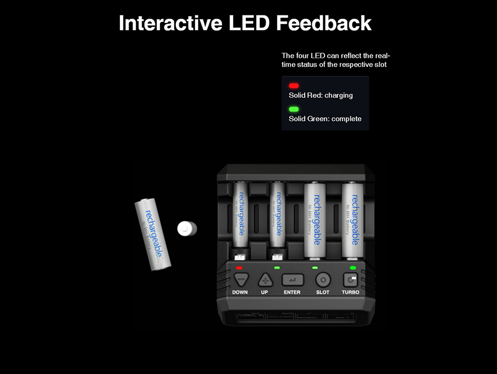 1.Rechargeable Battery Charger: Four independent slots allow charging four cells simultaneously.Four LED indicators make working status intuitive.Easy operation with five buttons.Five working modes of Turbo Charge, Charge, Discharge, Refresh & Analyze, Break-In