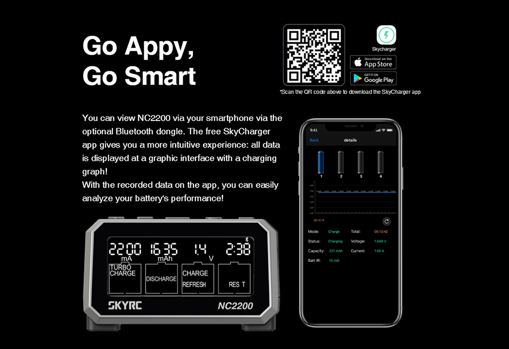 5.Smart Battery Charger: The charging graph and firmware upgrading can be accessible with the SkyCharger app if you connect the optional Bluetooth Dongle