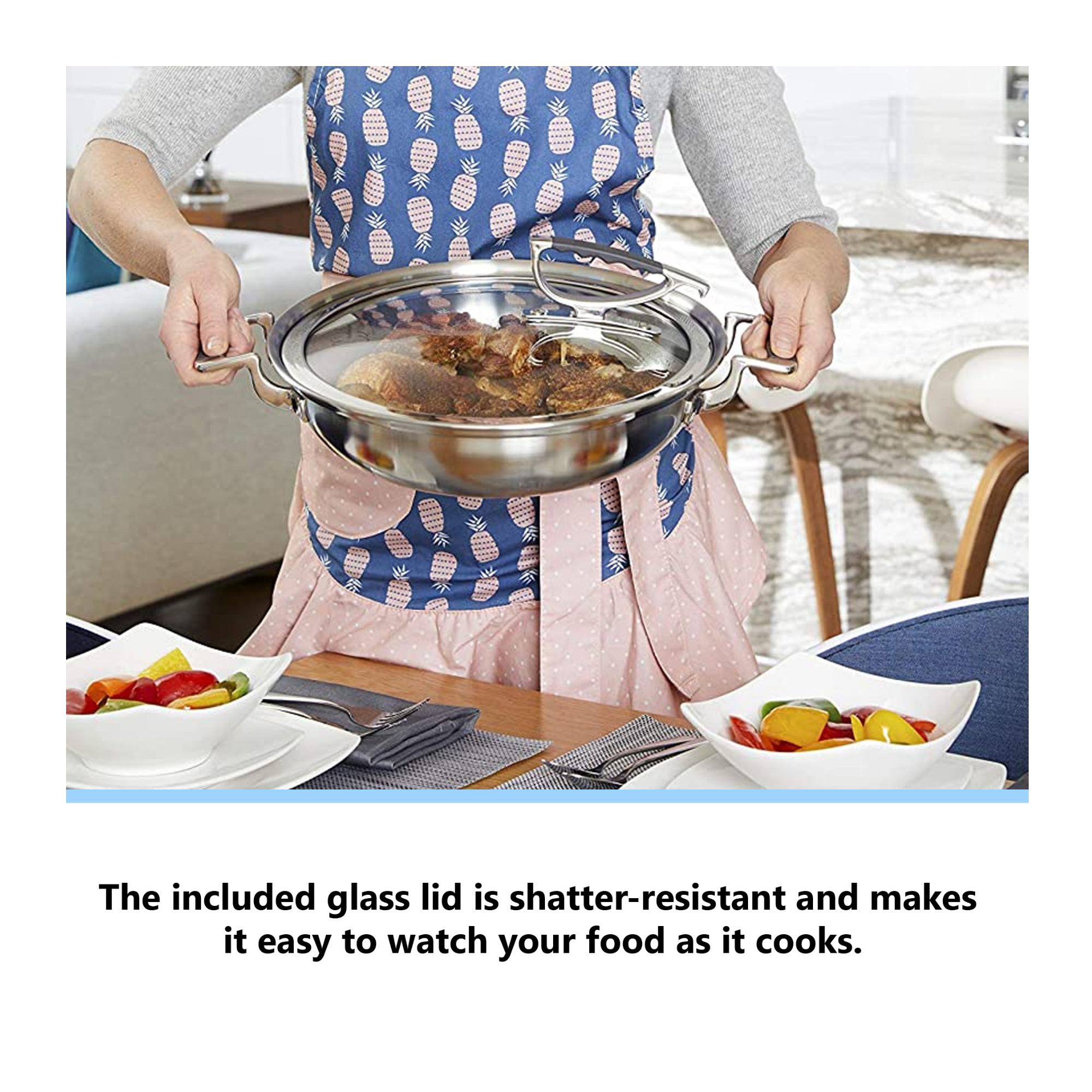 Cook Craft Cook Wear features a unique lid that latches to the side of the pan while you’re cooking eliminating heat rings and meal prep mess on your counters!