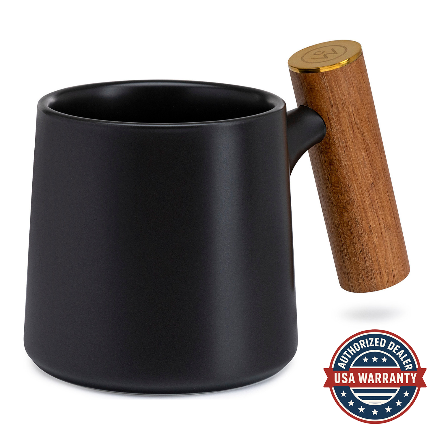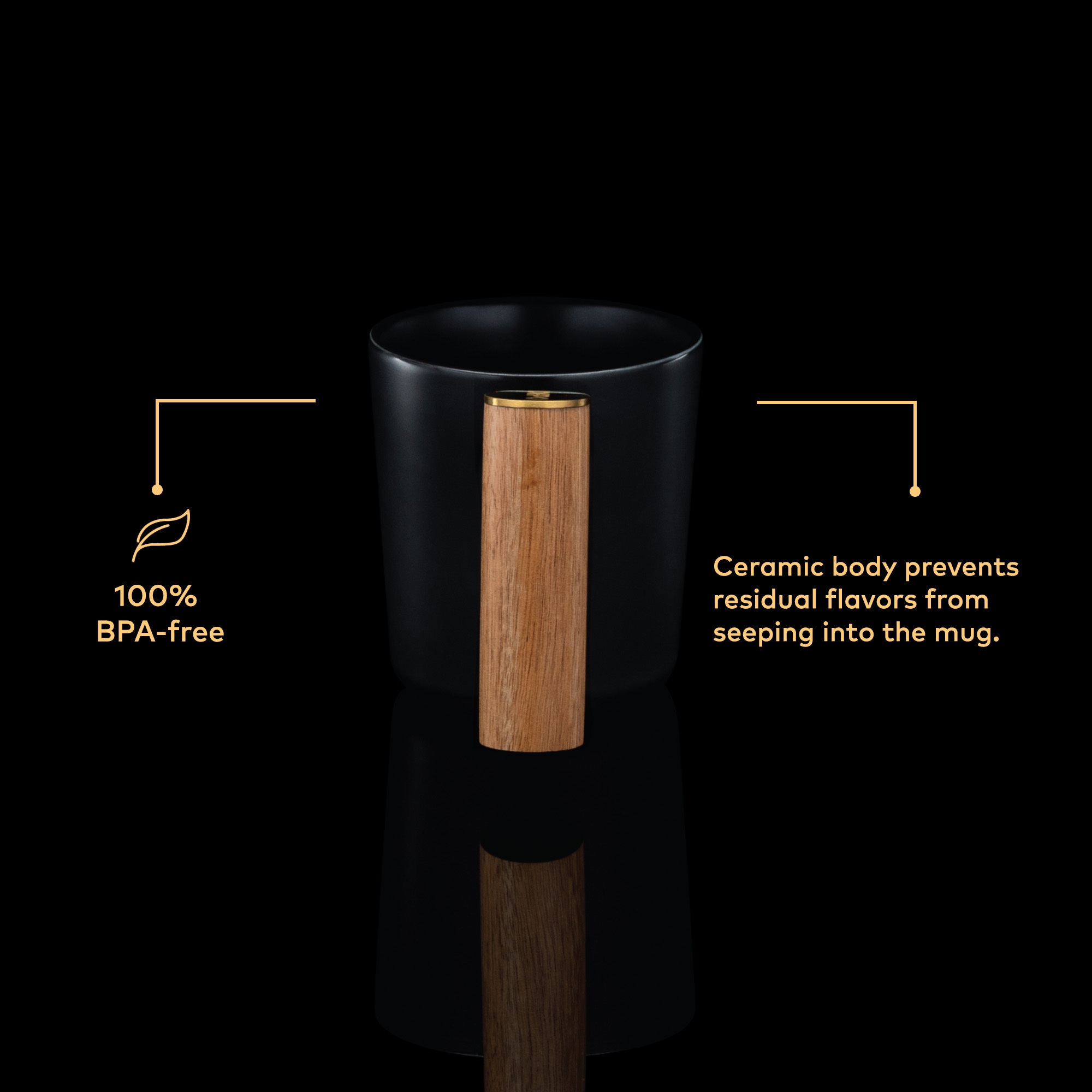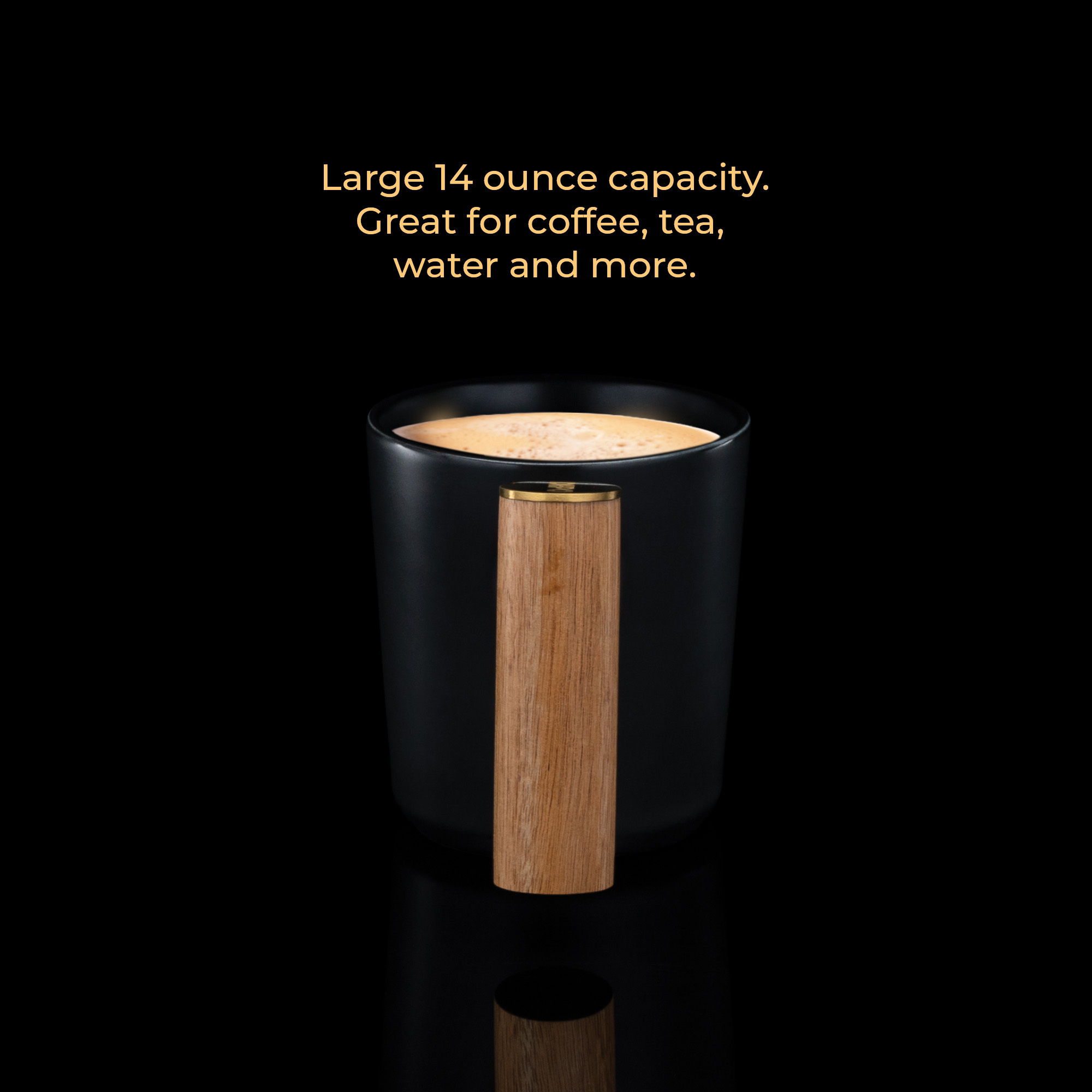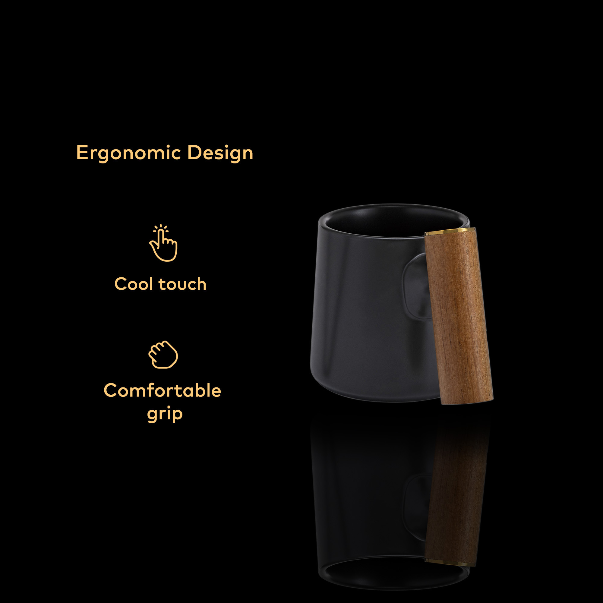 This mug has a sleek and stylish design with its matte black exterior and bamboo handle, adorned with a gold-plated Chefwave logo. Its ceramic body keeps your hot drinks heated and your cold drinks cool. The slanted bamboo handle provides a comfortable grip and stays cool unlike most ceramic mugs with a ceramic handle.