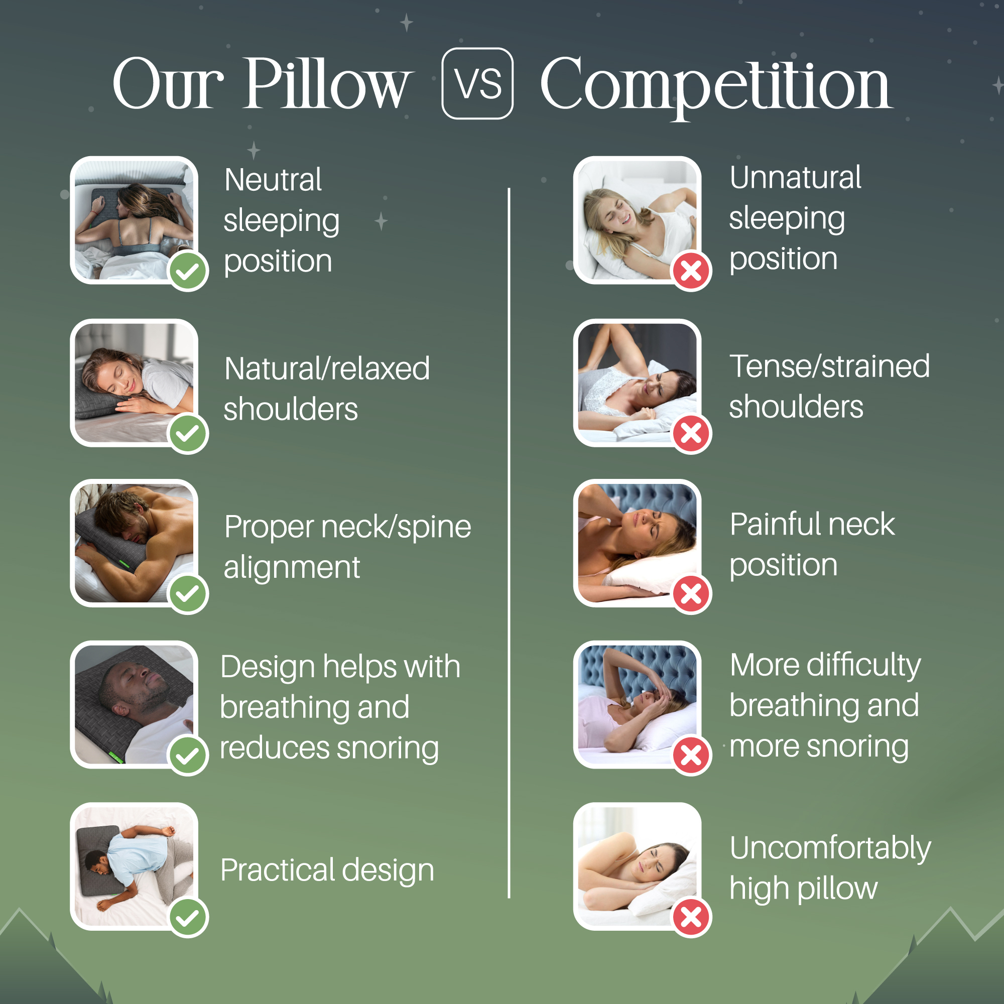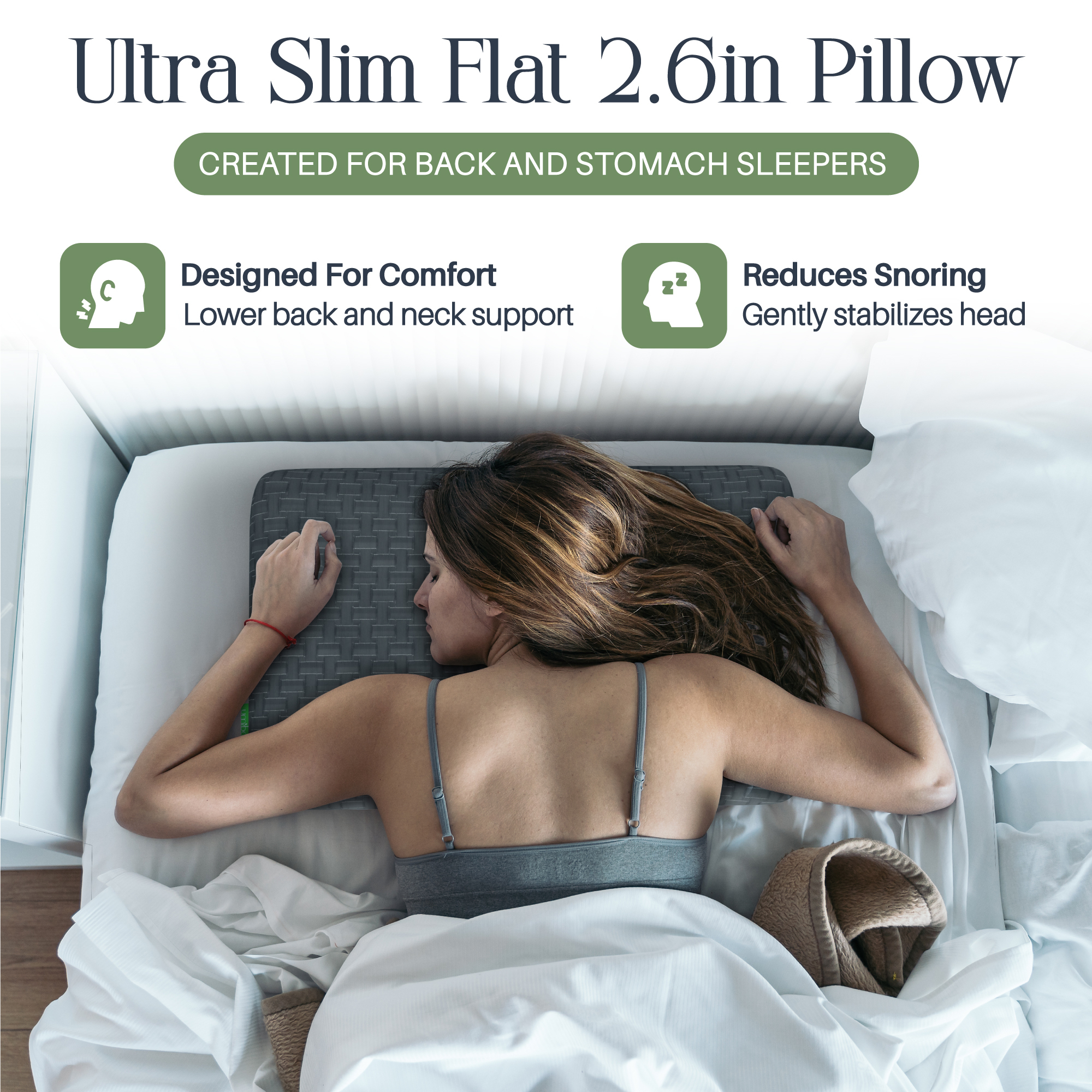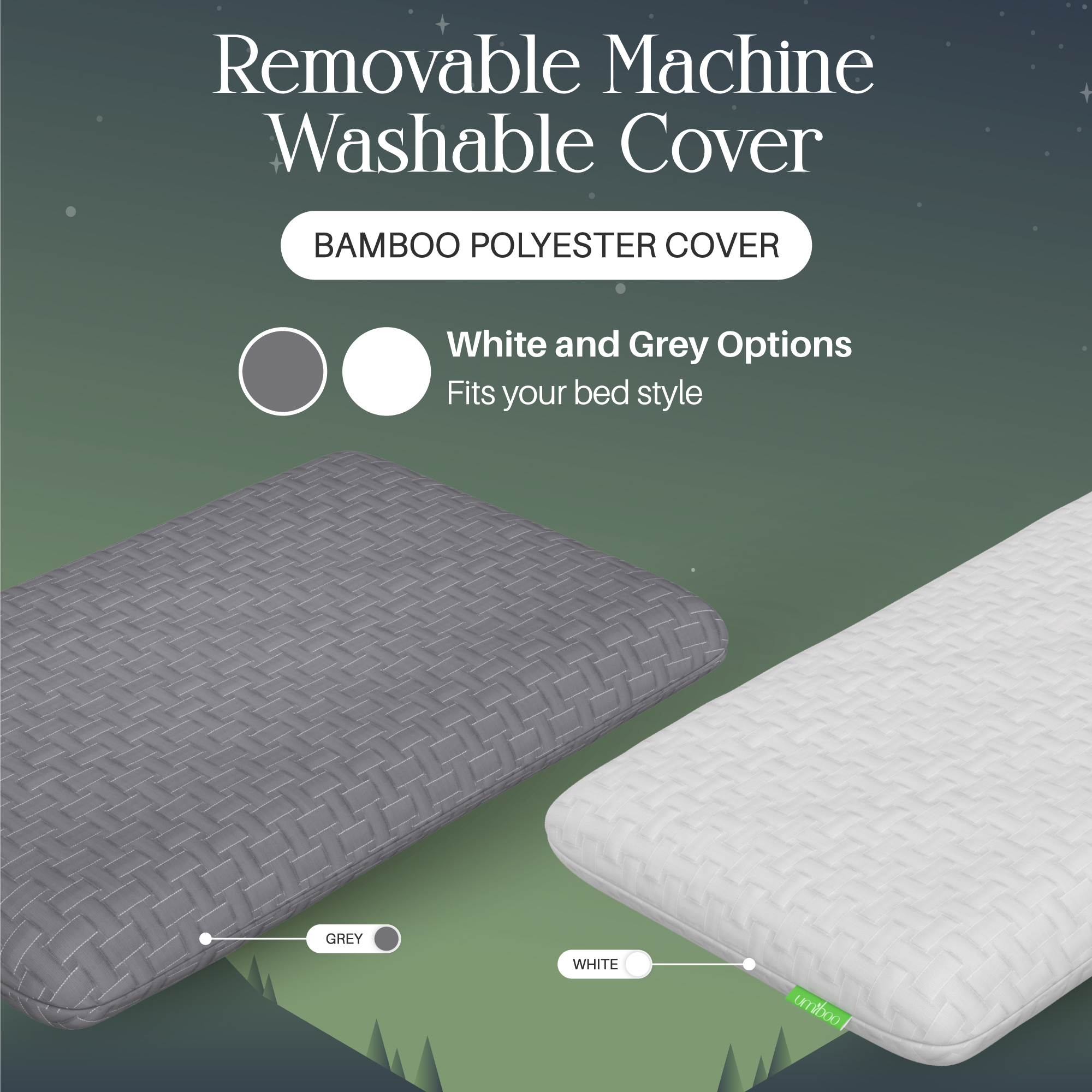 The flat design of the pillow promotes proper spinal alignment and reduces snoring, neck and shoulder pain. And to make your sleeping experience even better, we've included a zippered, removable Bamboo/Polyester (30/70) cover that's soft, and machine washable(in cool mode)