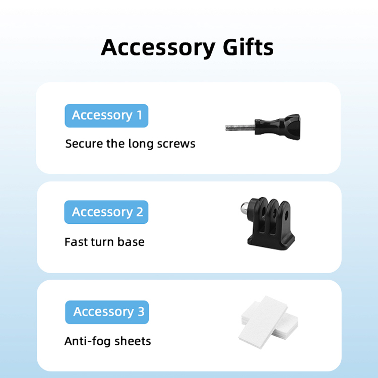 l 1x Waterproof Case, 1x Fast Turn Base, 1x Long Fixing Screw, 2x Anti-fog Sheet (Pack)
