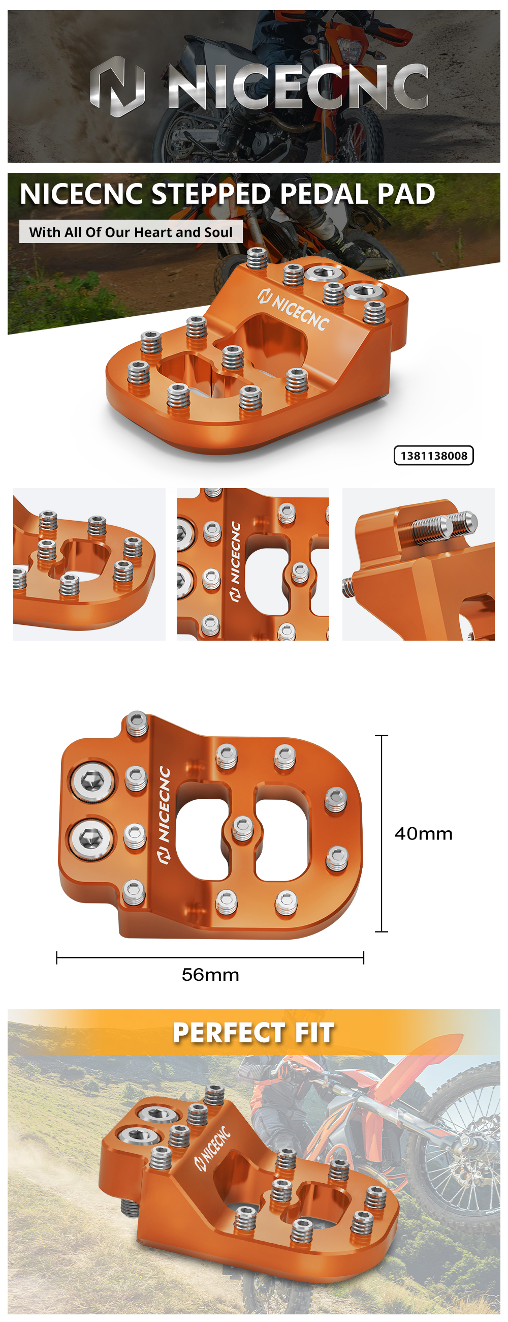 NICECNC Step-Up Rear Brake Pedal,Designed with both comfort and safety in mind, this custom-made pedal features a lower step for those who prefer sitting while riding, as well as an upper step for standing with toes pointed downwards. The lower contact area drops approximately 0.37 inches (9.4mm) to accommodate a more relaxed riding position, while the upper pedal maintains the original height for standing. With a larger surface area than the stock pedal, it provides better control and safety. The detachable flat sawtooth design offers improved grip, and the custom look is achieved with aerospace-grade 6061 aluminum alloy material and CNC cutting, finished with anodized surface treatment. Easy to install, it directly replaces the stock pedal.
