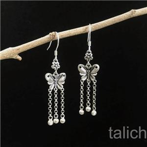 Sterling silver flower butterfly earrings with tassel droplets dangling below. Handcrafted with intricate details. The surface is brushed and oxidized to create matte soft sheen. Light weight and comfortable to wear. Unique and fun!