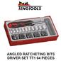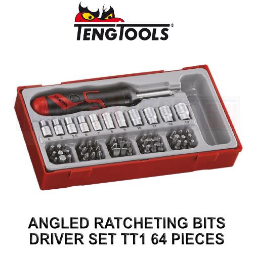 The Teng TTMDRT 64 piece set including a jointed bits driver with an adjustable angle setting, 11 regular 1/4″ drive metric sockets and 52 bits.