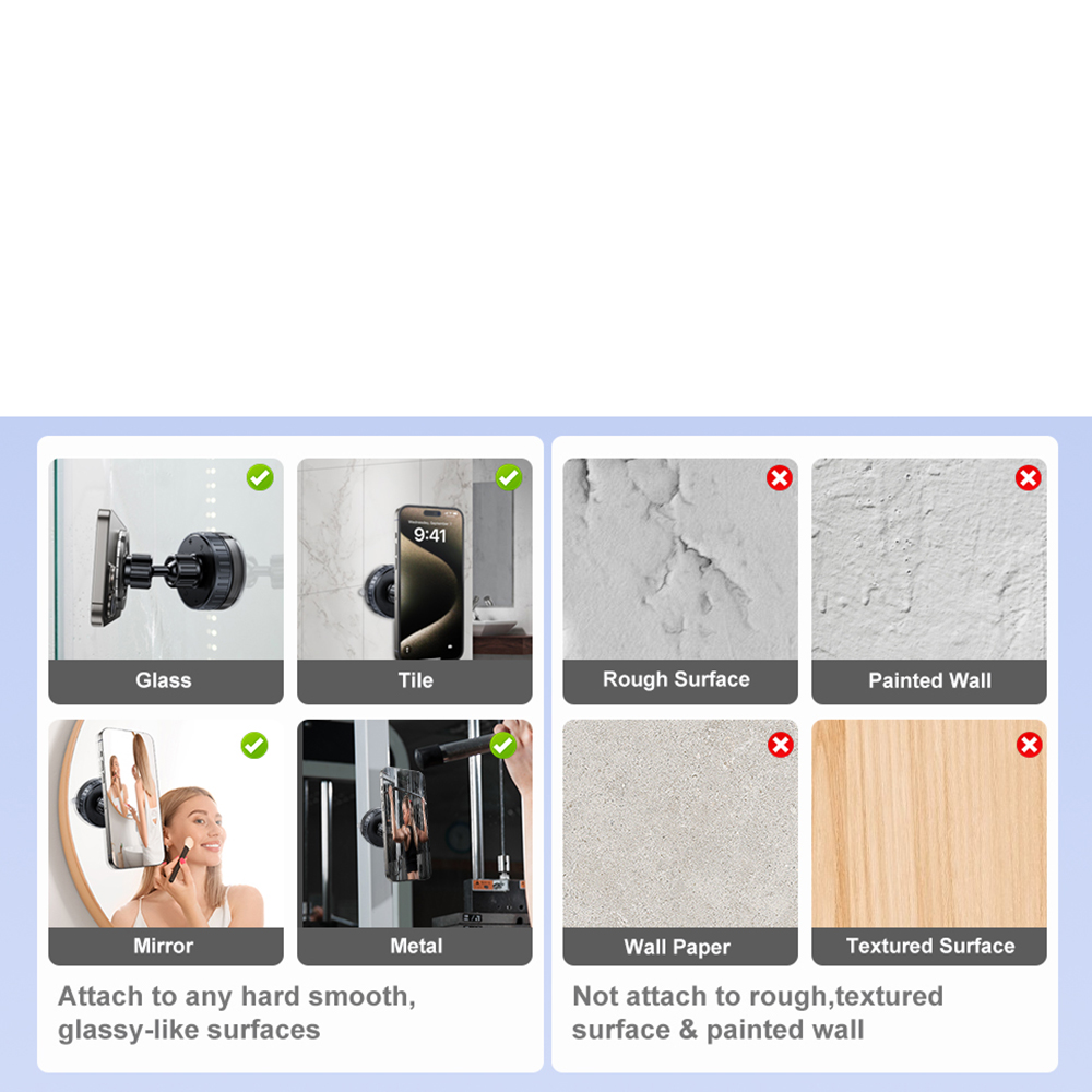 Wide application: The powerful vacuum suction cup mobile phone holder can fix the mobile phone to any smooth, shiny surface, such as mirror, glass,