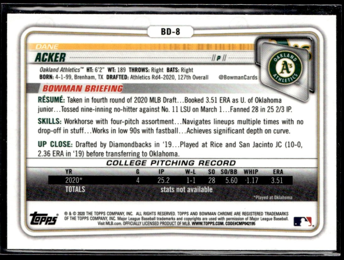 | 2020 Bowman Draft Chrome Dane Acker Oakland Athletics #BD-8 | ||||||||||||||||